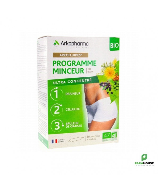 Description :UN RÉGIME MINCEUR BIO À BASE DE PLANTES EN 3 ÉTAPES1. Arkofluides Détox : 10 JOURS pour préparer votre corps et l'aider à se purifier avant de commencer à essayer de perdre du poids.Pissenlit (Taraxacum officinale). En Europe, le pissenlit est utilisé depuis longtemps comme agent drainant et détoxifiant. Il facilite l'élimination de l'eau et la purification de l'organisme. Il est particulièrement recommandé pendant la période des fêtes.Sureau noir (Sambucus nigra). Originaire d'Europe centrale, le Sureau est particulièrement répandu en Suisse et dans toutes les régions d'Europe au climat tempéré. Ses baies sont utilisées en phytothérapie pour leurs propriétés dépuratives car elles aident à purifier l'organisme de ses toxines.Radis noir (Raphanus sativus var. niger). Le radis noir est une racine épaisse et comestible à la saveur caractéristique, à laquelle a été ajouté du jus de citron (Citrus limon) pour son goût rafraîchissant.2. Arkofluides Starter Minceur : 10 JOURS pour commencer à maigrir.Le maté (Ilex paraguariensis) favorise la transformation des graisses en énergie. Par ailleurs, cette plante d'Amérique latine est aussi appréciée pour ses vertus tonifiantes, notamment en début de programme minceur pour aider à « se ressourcer ».Le fenouil (Foeniculum vulgare) est connu depuis l'Antiquité dans le bassin méditerranéen pour aider les fonctions d'élimination et de drainage de l'organisme.Le raisin (Vitis vinifera) facilite la microcirculation, contribuant ainsi à l'élimination des toxines.L'ananas (Ananas comosus) complète cette association.3. Arkofluides Booster Minceur : 10 JOURS pour renforcer et pérenniser votre régime minceur.Le thé vert (Camellia sinensis) (appelé aussi thé vierge), dont seules les jeunes feuilles sont utilisées, est un thé non fermenté afin de conserver toutes ses propriétés naturelles. Le thé vert contribue au métabolisme des graisses.Le guarana (Paullinia cupana) est couramment utilisé pour favoriser la combustion des graisses.La reine des prés (Filipendula ulmaria) aide à éliminer l'eau et les toxines de l'organisme.Le café vert (Coffea arabica, Coffea canephora) complète cette association.Conçue et fabriquée en France, la gamme Arkofluides® vous offre le meilleur de la nature.Pour en savoir plus sur ULTRAextract®, rendez-vous sur Arkofluides®, l'innovation Ultra Concentrée.Conseils d'utilisation :Complément alimentaire.Pour adultes seulement.Prendre 1 ampoule par jour, le matin ou le midi.Ne pas dépasser la dose journalière recommandée.Il est possible de renouveler la prise plusieurs fois par an.Déconseillé aux femmes enceintes ou allaitantes.Les flacons Starter et Booster contiennent de la caféine, respectivement 10 mg et 15 mg par flacon.Flacons de rappel : Déconseillé aux personnes allergiques aux salicylates. Si vous êtes sous traitement anticoagulant, demandez conseil à votre médecin.Les compléments alimentaires ne doivent pas être utilisés comme substitut d'une alimentation variée et équilibrée et d'un mode de vie sain.Tenir hors de portée des jeunes enfants.Mode d'emploi :-Agiter le flacon avant ouverture. Comme il s'agit d'un produit naturel, il peut y avoir une petite quantité de sédiments, mais cela n'affecte en rien la qualité du produit.-Tapotez chaque extrémité du flacon avec votre index pour l'affaiblir. À l'aide d'une serviette en papier, cassez la première extrémité du verre pour éviter toute chute de débris.-Retournez le flacon et placez la première extrémité sur le verre. Cassez la seconde extrémité, loin du verre, à l'aide d'un essuie-tout. Laisser le liquide s'écouler. Ajouter l'équivalent d'un demi-verre d'eau ou de jus de fruits (125 ml).Ingrédients :Etape 1 : Arkofluides DétoxConcentré de racine de pissenlit bio (Taraxacum officinale) - Jus concentré de pomme bio (Malus domestica) - Jus concentré de sureau bio (Sambucus nigra) - Jus de radis noir bio (Raphanus sativus var. niger) - Jus concentré de citron bio (Citrus limon)Etape 2 : Arkofluides Starter MinceurExtrait de plante biologique [obtenu à partir de 500 mg de feuille de Maté biologique (Ilex paraguariensis), 500 mg de fruit de Fenouil biologique ( Foeniculum vulgare ) et 500 mg de marc de Raisin biologique ( Vitis vinifera ) utilisés par ampoule] - Jus concentré d'Ananas biologique ( Ananas comosus ) - Jus concentré de pomme biologique (Malus domestica).Etape 3 : Arkofluides Booster MinceurExtrait aqueux végétal bio, obtenu à partir de 400 mg de feuille de thé vert bio (Camellia sinensis), 300 mg de graine de café vert bio (Coffea arabica, Coffea canephora), 280 mg de graine de guarana bio (Paullinia cupana) et 20 mg de reine des prés bio sommité fleurie Filipendula ulmaria) - Jus concentré de pruneau bio (Prunus domestica) - Jus concentré de pomme bio (Malus domestica).