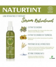 NATURTINT SERUM RESTRUCTURANT REPARATEUR 125ML NATURTINT SERUM RESTRUCTURANT REPARATEUR est un soin capillaire régénérant formulé avec des ingrédients d'origine naturelle. Ses principes actifs agissent à l'origine des cheveux pour les renforcer et les redensifier. Dès la première application, les cheveux ce rédensifient, scellent et acquièrent une luminosité extraordinaire. Formule multi-active sans parabènes, silicones, sulfates, alcool dénaturé, cires, phtalates, huile minérale et paraffine liquide. 99,1% d'ingrédients d'origine naturelle, certifiés ECOCERT Nourrit, hydrate et répare les pointes fourchues. Réparation, force, luminosité et anti-âge. Réduit les pointes fourchues. Réduit les risques de cassure. Hydrate les cheveux. Fournit de la force et réduit la casse des cheveux. Convient à la méthode Curly – Testé dermatologiquementIngrédients Composition : AQUA (PURIFIED WATER). BETAINE. POLYGLYCERYL-4 LAURATE/SEBACATE. POLYGLYCERYL-6 CAPRYLATE/CAPRATE. HELIANTHUS ANNUUS SEED EXTRACT*. HYDROLYZED WHEAT PROTEIN. HYDROLYZED ADANSONIA DIGITATA SEED EXTRACT. GUAR HYDROXYPROPYLTRIMONIUM CHLORIDE. DICAPRYLYL ETHER. DECYL GLUCOSIDE. GLYCERYL OLEATE. PARFUM. SODIUM BENZOATE. POTASSIUM SORBATE. BENZOIC ACID. BENZYL ALCOHOL. CITRIC ACID. LIMONENE.