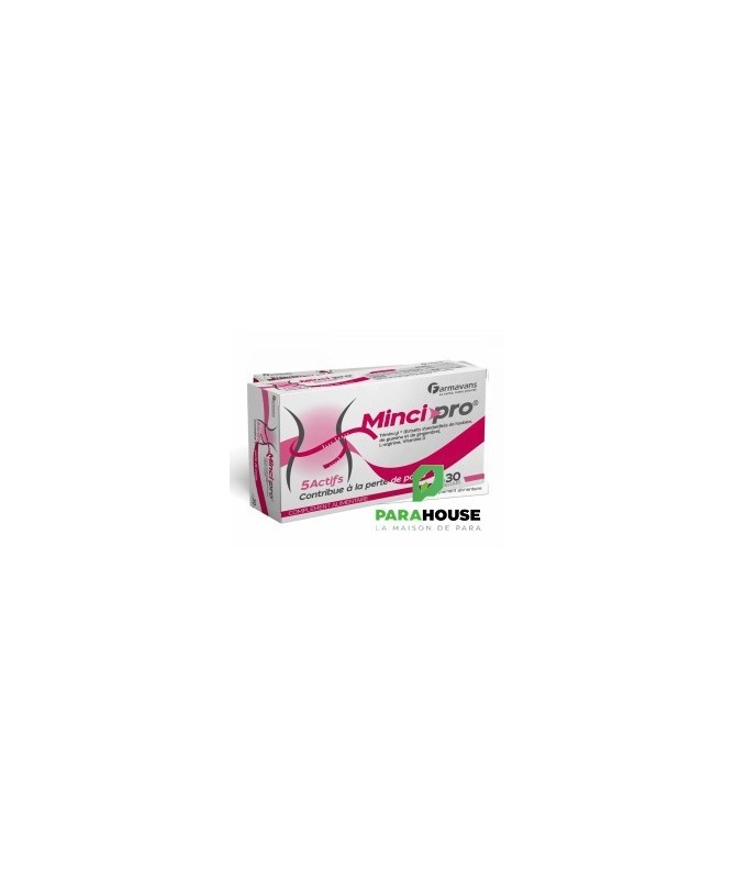 Description :MINCIPRO est un complément alimentaire à base de Trimincyl ®, un mélange de trois extraits standardisés de de houblon, de guarana et de gingembre.Dans quels cas utiliser ce produit :MINCIPRO est un complément alimentaire à base de Trimincyl ®un mélange de trois extraits standardisés de de houblon, de guarana et de gingembre.MINCIPRO contient aussi la L'arginine et la vitamine D.MINCIPRO contribue à la perte de poids.Conseils d'utilisation :Posologie: Une gélule deux fois par jourComposition :TRIMINCYL® 200 mg, mélange contenant :Extrait de cônes de houblon, Humulus lupulus L.standardisé à 0,3% de rutine…100 mgExtrait sec de guarana standardisé à 22 % decaféine naturelle………60 mgExtrait sec de Zingiber Officinalestandardisé à 5% de gingérol……….40 mgL-arginine……..50 mgVitamine D…….5 µgCorrespondant à 100% des VNR (valeurs nutritionnelles de référence).Excipients : Cellulose microcristalline, stéarate de Magnésium.
