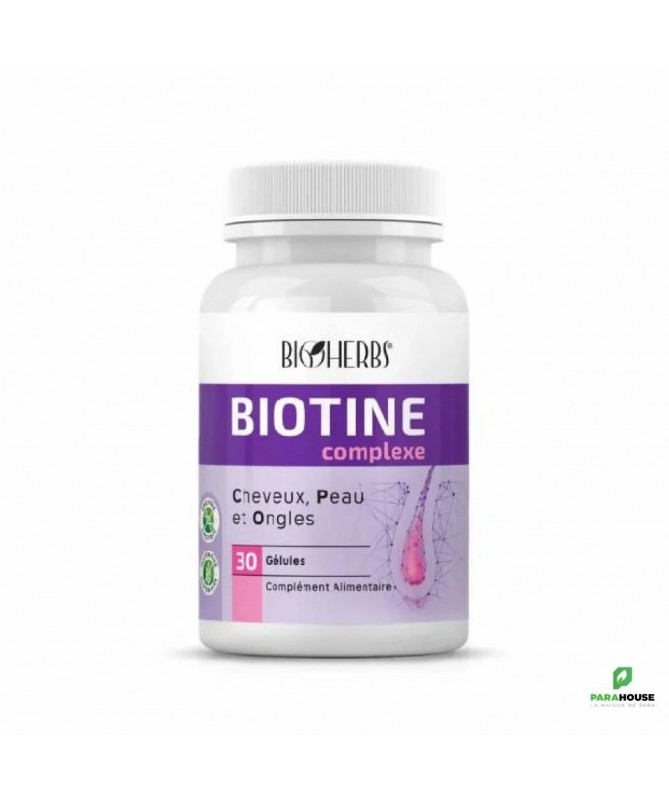 BIOHERBS BIOTINE 30 GELULES BIOHERBS BIOTINE ou vitamine B8, également appelée vitamine B7 ou vitamine H, est une vitamine hydrosoluble essentielle pour le bon fonctionnement de l'organisme. La Biotine de Bioherbs fait partie de la famille des vitamines B et joue un rôle crucial dans de nombreuses fonctions biologiques. La biotine est naturellement présente dans de nombreux aliments, mais elle est également disponible sous forme de supplément alimentaire. Soutien à la santé des cheveux Soutien à la santé de la peau Soutien à la santé des ongles Métabolisme des macronutriments Régulation de la glycémie Soutien à la santé cérébrale Soutien à la santé du système nerveux Régénération cellulaire Composition : Biotine 2500 mcg Zinc ( Bisglycinate chelaté ) 10 mg Kératine Hydrolysée 75 mg Sélénium 55 mcg Extrait Racine d'ortie 4:1 100 mg Agent de charge Cellulose microcristalline Conseils d'utilisation : Quand prendre? Après le repas Matin ou soir Combien de gélule ? 1 gélule par jour Comment prendre ? À prendre avec un grand verre d'eau Durée d'un flacon ? 30 jours Par mesure de précaution n’est pas recommandée aux femmes enceintes Ne pas dépasser les doses journalières indiquées Ne doublez jamais une dose pour compenser une dose oubliée Si vous oubliez de prendre une dose, prenez-la le plus tôt possible, sauf si c'est près de l'heure de la dose suivante, alors la dose oubliée sera sautée et la dose suivante sera prise à l'heure spécifiée Les compléments alimentaires ne peuvent en aucun cas se substituer à une alimentation variée et équilibrée Si vous suivez un traitement médical, il est indispensable de demander conseil à un professionnel de la santé Conserver dans un endroit sec, à l'abri de l'humidité, à une température inférieure à 25° C et hors de portée des enfants.