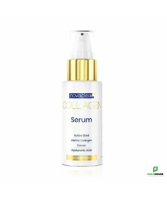 NOVACLEAR COLLAGEN SERUM 30ML NOVACLEAR COLLAGEN SERUM est un sérum liftant infusé de caviar et d'acide hyaluronique, conçu pour hydrater et lisser la peau en profondeur. Sa combinaison unique d'extraits botaniques nourrit et unifie le teint. Enrichi en or actif et en collagène marin, ce sérum contribue à améliorer la fermeté et l'élasticité de la peau, tandis que l'allantoïne apaise les irritations. Ce sérum léger pour le visage pénètre rapidement et laisse la peau douce et lisse. Bienfaits de NOVACLEAR COLLAGEN SERUM : Hydratation intense : Grâce au caviar et à l'acide hyaluronique, ce sérum hydrate la peau en profondeur, pour un grain de peau plus lisse. Fermeté et élasticité améliorées : L’ajout d’or actif et de collagène marin à la formule contribue à améliorer la fermeté et l’élasticité de la peau, pour une apparence plus jeune. Soulagement apaisant : L’allantoïne, reconnue pour ses propriétés apaisantes, aide à calmer les irritations, laissant la peau confortable et équilibrée. Absorption rapide : Ce sérum léger pour le visage est conçu pour pénétrer rapidement dans la peau, offrant des bienfaits instantanés sans sensation de lourdeur ni de gras. Le sérum au collagène Novaclear convient aux personnes souhaitant lutter contre la sécheresse cutanée, unifier leur teint et améliorer la fermeté et l'élasticité de leur peau. Idéal pour celles et ceux qui recherchent un sérum léger à absorption rapide qui hydrate et nourrit efficacement la peau Composition : Aqua, Propylene Glycol, Panthenol, Glycerin, PEG-40 Hydrogenated Castor Oil, Sodium Hyaluronate, Caviar Extract, Paeonia Officinalis Flower Extract, Rosa Canina Fruit Extract, Arnica Montana Flower Extract, Citrus Limon Fruit Extract, Eleutherococcus Senticosus Root Extract, Tocopheryl Acetate, Retinyl Palmitate, Collagen Amino Acids, Allantoin, Gold, Lactose, Mica, Titanium Dioxide, Cl 77491, Acrylates/C10-30 Alkyl Acrylates Crosspolymer, Potassium Silicate, Aluminum Silicate, Sodium Benzoate, Potassium Sorbate,Phenoxyethanol, Ethylhexylglycerin, Tetrasodium EDTA, Triethanolamine, Parfum, Tocopherol, Sodium Hydroxide. Conseils d'utilisation : Commencez par nettoyer votre visage pour une peau propre et fraîche, puis déposez quelques gouttes de sérum sur le bout de vos doigts. Appliquez le sérum sur votre peau propre en massant délicatement le visage, le cou et le décolleté. Effectuez des mouvements ascendants et vers l'extérieur pour une absorption optimale.