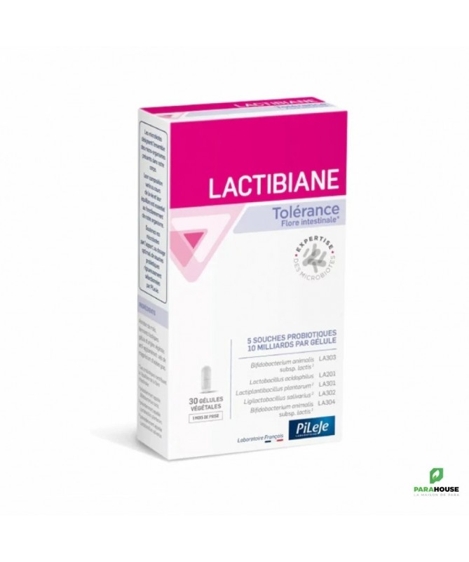 PILEJE Lactibiane Tolerance 30 Gelules PILEJE Lactibiane Tolerance complément alimentaire contenant 5 souches probiotiques dosées à 10 milliards par gélule : Bifidobacterium lactis LA303 Lactobacillus acidophilus LA201 Lactiplantibacillus plantarum LA301, précédemment appelée Lactobacillus plantarum LA301 Ligilactobacillus salivarius LA302, précédemment appelée Lactobacillus salivarius LA302 Bifidobacterium animalis subsp. lactis LA304, précédemment appelée Bifidobacterium lactis LA304 Composition : Amidon de maïs, ferments lactiques, gélule d'origine végétale, anti-agglomérant : sels de magnésium d'acide gras. Conseils d'utilisation : 1 gélule de Lactibiane par jour à avaler avec un grand verre d’eau. À prendre avant un repas. Conservation : dans un endroit frais et sec. Ne pas dépasser les doses journalières recommandées. Ce complément alimentaire ne peut se substituer à une alimentation variée, équilibrée et à un mode de vie sain. À tenir hors de portée des enfants. À consommer de préférence avant fin et n° de lot mentionnés sur la face inférieure de l'étui.