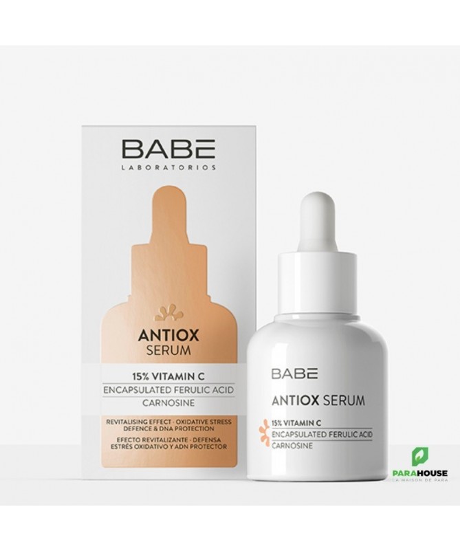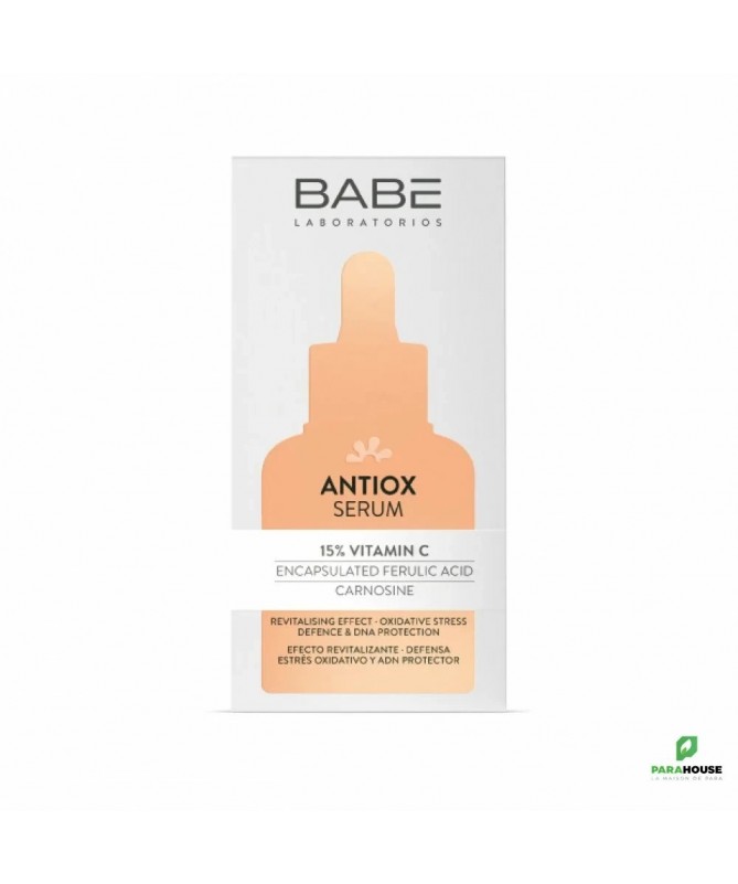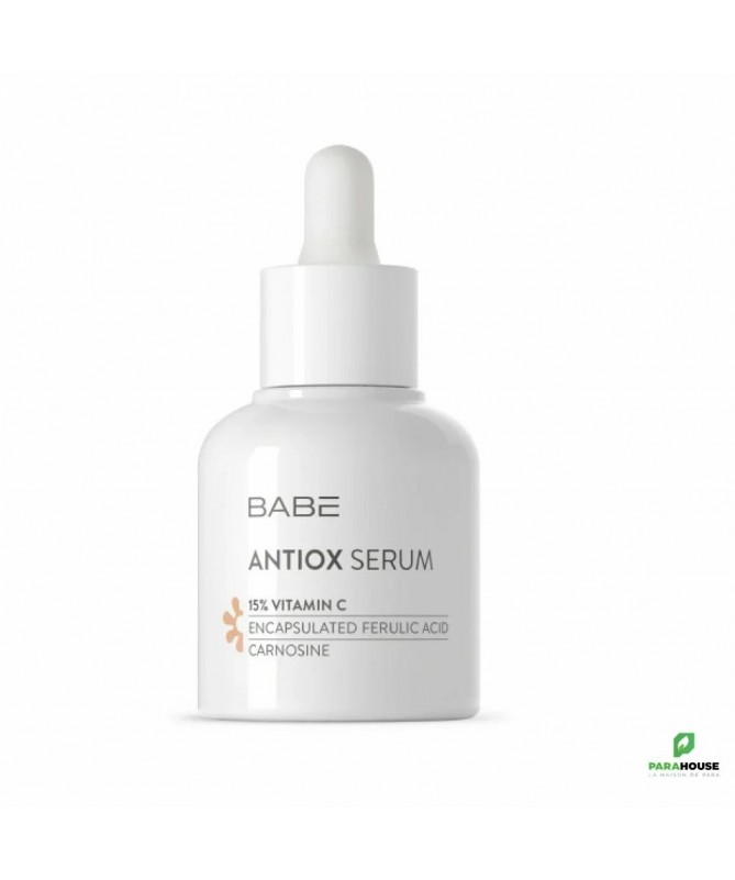 BABE ANTIOX SERUM VITAMINE C 30ML - Sérum Antioxydant et Éclat Peau BABE ANTIOX SERUM est un bouclier antioxydant quotidien qui combat les signes du vieillissement accéléré causé par la pollution et la lumière bleue. Sa formule stabilisée à 15% de Vitamine C agit pour illuminer le teint, estomper les taches et protéger l'ADN cellulaire. BABE ANTIOX SERUM est un soin complet qui agit comme un bouclier invisible contre les agressions environnementales responsables du photovieillissement. Spécialement formulé pour les défis des peaux urbaines, il combine des actifs antioxydants majeurs pour neutraliser les radicaux libres avant qu'ils n'endommagent la peau. Sa texture fluide et légère, non grasse et à l'absorption rapide, en fait un partenaire idéal pour le soin du matin. Elle prépare la peau à affronter la journée sans la surcharger, laissant une sensation de fraîcheur et de confort. Ce sérum est le partenaire parfait pour celles et ceux qui cherchent à préserver la jeunesse de leur peau de manière proactive. L'efficacité de ce sérum antioxydant repose sur un complexe breveté d'actifs synergiques : Vitamine C Stabilisée (15%) : Une forme hautement stable et puissante de Vitamine C qui ne s'oxyde pas. Elle illumine le teint, uniformise la pigmentation et stimule la production de collagène pour une peau plus ferme. Acide Férulique Encapsulé (0,10%) : Cet antioxydant majeur potentialise l'action de la Vitamine C et offre une protection renforcée contre les UV et la pollution. Carnosine (0,20%) : Un puissant protecteur cellulaire qui prévient les dommages causés par le stress oxydatif à l'ADN, ralentissant ainsi le vieillissement prématuré. Acide Hyaluronique (0,10%) : Il complète l'action en apportant une hydratation immédiate, repulpant les ridules et assurant un teint frais et rebondi. Pré et Postbiotiques (0,50%) : Ils renforcent le microbiome de la peau, améliorant sa résistance naturelle aux agressions quotidiennes. Les Avantages Clés : Bouclier Anti-Pollution et Lumière Bleue : Protège efficacement la peau contre le stress oxydatif généré par la pollution urbaine et les écrans. Éclat Immédiat et Teint Uniforme : La Vitamine C estompe les taches et illumine le teint pour un résultat "good skin" dès les premières utilisations. Protection de l'ADN Cellulaire : La Carnosine aide à préserver l'intégrité des cellules pour une jeunesse cutanée prolongée. Action Anti-Âge Préventive : Lutte contre les rides et ridules en protégeant les fibres de collagène et d'élastine. Texture Légère et Pénétrante : Non grasse, elle s'intègre parfaitement sous la crème solaire et le maquillage. Hydratation et Apaisement : L'acide hyaluronique et les prébiotics assurent confort et équilibre, même pour les peaux sensibles. Composition : AQUA,3-O-ETHYL ASCORBIC ACID,PROPYLENE GLYCOL,PROPANEDIOL,CITRIC ACID,FERULIC ACID,CARNOSINE,SAPONARIA OFFICINALIS LEAF/ROOT EXTRACT,SODIUM HYALURONATE,GLYCERIN,DIMETHICONE,SODIUM CITRATE,INULIN,PPG-26-BUTETH-26,SODIUM BENZOATE,POLYACRYLATE CROSSPOLYMER-6,SODIUM METABISULFITE,TETRASODIUM GLUTAMATE DIACETATE,PEG-40 HYDROGENATED CASTOR OIL,POTASSIUM SORBATE,POLYSILICONE-11,TETRAHEXYLDECYL ASCORBATE,XANTHAN GUM,ALPHA-GLUCAN OLIGOSACCHARIDE,PHOSPHOLIPIDS,BUTYLENE GLYCOL,POLYGLYCERYL-10 LAURATE,CAPRYLIC/CAPRIC TRIGLYCERIDE,DECYL GLUCOSIDE,CAPRYLYL GLYCOL,HEXYLENE GLYCOL,PARFUM,PHENOXYETHANOL Conseils d'utilisation : Appliquer 3 à 4 gouttes sur la peau propre et sèche du visage, du cou et du décolleté. Masser jusqu'à absorption complète. Convient à tous les types de peau, même les peaux sensibles ou sensibilisées.