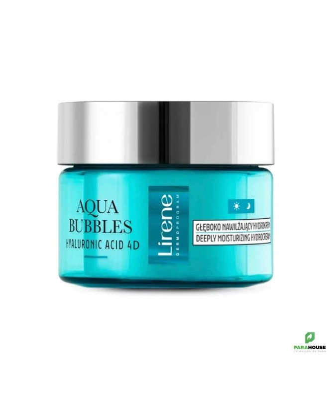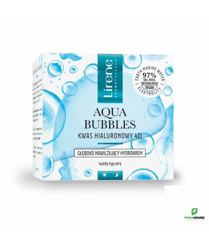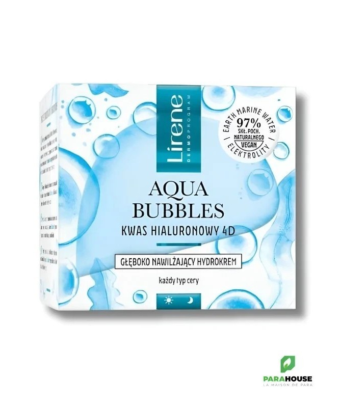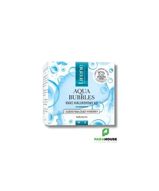 LIRENE AQUA BUBBLES HYDRO CREME 50ML LIRENE AQUA BUBBLES HYDRO CREME est une hydrocrème riche et profondément hydratante se chargera de la gestion de l'eau et de la régénération de votre peau, pour qu'elle brille d'un éclat naturel ! Offrez à votre peau une hydratation instantanée avec les cosmétiques Lirene Aqua Bubbles. Riche en ingrédients et une formule légère qui garantit une absorption rapide. Microcapsules de vitamines libérant des vitamines. Un parfum rafraîchissant qui enveloppe subtilement la peau. Composition : 220810 Składniki/Ingredients: Aqua (Water), Propanediol, Dicaprylyl Carbonate, Isopropyl Palmitate, Glyceryl Stearate Citrate, Cetearyl Alcohol, Aloe Barbadensis Leaf Juice, Tripelargonin, 1,2-Hexanediol, Squalane, Glyceryl Stearate, Oryza Sativa (Rice) Bran Oil, Maris Aqua (Sea Water), Mannitol, Sodium Hyaluronate, Copper Gluconate, Zinc Gluconate, Sodium Acetylated Hyaluronate, Sodium Hyaluronate Crosspolymer, Hydrolyzed Sodium Hyaluronate, Hydroxyacetophenone, Tocopherol, Tocopheryl Acetate, Butyrospermum Parkii (Shea) Butter, Helianthus Annuus (Sunflower) Seed Oil, C14-22 Alcohols, Glycerin, C12-20 Alkyl Glucoside, Stearalkonium Hectorite, Carbomer, Microcrystalline Cellulose, Sodium Hydroxide, Propylene Carbonate, Kaolin, Silica, Hydroxypropyl Methylcellulose, Calcium Gluconate, Magnesium Sulfate, Pentylene Glycol, Ethylhexylglycerin, Gluconolactone, Sodium Benzoate, Potassium Sorbate, Parfum (Fragrance), CI 77007 (Ultramarines), CI 42090 (FD&C Blue No. 1) Conseils d'utilisation : Matin et soir, massez la crème LIRENE AQUA BUBBLES sur la peau du visage, du cou et du décolleté.