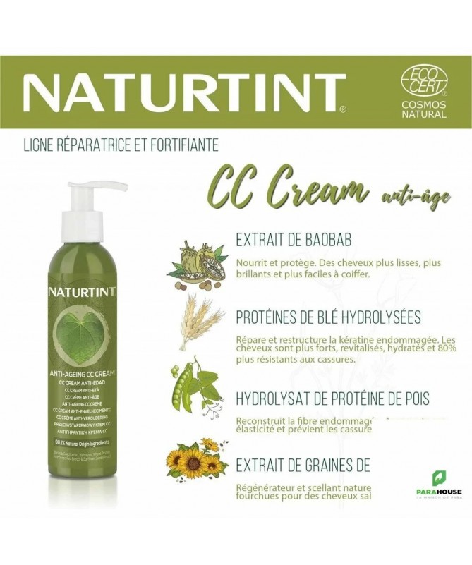 NATURTINT CC CREAM ANTI AGE 200ML NATURTINT CC CREAM ANTI AGE est un traitement capillaire naturel anti-âge et réparateur intensif formulé avec des ingrédients naturels et biologiques qui stoppent les signes du vieillissement des cheveux, reconstruisent la kératine des cheveux et les protègent des effets négatifs du soleil, de la chaleur et de la pollution. Avec l'après-shampooing sans rinçage Naturtint CC Cream permet de lissez et hydratez pour les cheveux au quotidien. Sans danger pour la couleur et au pH équilibré pour protéger et maintenir une couleur de cheveux éclatante et durable. Avec 96 % d'ingrédients d'origine naturelle, cette formule est enrichie d'extraits de beurre de karité, de baobab et de graines de tournesol pour hydrater et nourrir des cheveux plus faciles à coiffer et sans enchevêtrement. Revitalisez et démêlez tout en conservant la couleur, l’éclat et la brillance. Formulé avec des ingrédients de haute qualité pour les meilleurs résultats. 96 % d'origine naturelle selon la norme mondiale ISO 16128. Toujours sans parfums artificiels, sans parabènes et sans silicones ! Composition : WATER (AQUA). CETEARYL ALCOHOL. QUATERNIUM-80. PROPYLENE GLYCOL. HELIANTHUS ANNUUS (SUNFLOWER) SEED EXTRACT. HYDROLYZED PEA PROTEIN. HYDROLYZED ADANSONIA DIGITATA SEED EXTRACT. MORINGA PTERIGOSPERMA SEED EXTRACT. BEHENTRIMONIUM METHOSULFATE. GLYCERIN. POTATO STARCH MODIFIED. FRAGRANCE (PARFUM)*. CITRIC ACID. DISODIUM PHOSPHATE. SODIUM BENZOATE. POTASSIUM SORBATE. BENZYL ALCOHOL. LIMONENE. LINALOOL. CITRONELLO