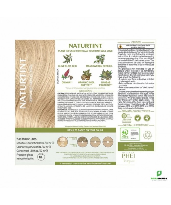 NATURTINT COLORATION PERMANENTE 10N BLOND AUBE NATURTINT COLORATION PERMANENTE est une coloration permanente sans ammoniaque choisie par les consommateurs du monde entier qui recherchent douceur, brillance, hydratation et confort maximal du cuir chevelu. Sa formule gel innovante et exclusive enrichie en ingrédients naturels respecte grandement la santé des cheveux. Il comprend également un traitement exclusif MultiCare Quinoa Mask, qui améliore le processus de coloration et augmente la fixation de la couleur de 20 %. Formulée avec jusqu'à 92% d'ingrédients d'origine naturelle, cette coloration vous offre une beauté naturelle sans compromis. Sans ammoniaque, elle respecte votre cuir chevelu et vos cheveux. Avec une couverture des cheveux blancs allant jusqu'à 100%, vous obtiendrez une couleur riche et uniforme. Composition : COLORANT: PEG-2 OLEAMINE. WATER (AQUA). ALCOHOL DENAT. PEG-4 RAPESEEDAMIDE. PROPANEDIOL. OLEIC ACID. ETHANOLAMINE. p-PHENYLENEDIAMINE. HYDROLYZED OAT PROTEIN. HYDROLYZED CORN PROTEIN. HYDROLYZED SOY PROTEIN. HYDROLYZED WHEAT PROTEIN. MEADOWFOAM (LIMNANTHES ALBA) SEED OIL. TETRASODIUM GLUTAMATE DIACETATE. SODIUM METABISULFITE. SODIUM ERYTHORBATE. N,N-BIS (2-HYDROXYETHYL)-p-PHENYLENEDIAMINE SULFATE. 2-AMINO-4-HYDROXYETHYLAMINOANISOLE SULFATE. 4-CHLORORESORCINOL. OCTADECYL DI-T- BUTYL-4-HYDROXYHYDROCINNAMATE. COLOR DEVELOPER: WATER (AQUA). HYDROGEN PEROXIDE. CETYL ALCOHOL. CETEARYL ALCOHOL. CETEARETH-20. LAURETH-3. OXYQUINOLINE SULFATE. PHOSPHORIC ACID QUINOA MASK: WATER (AQUA). CETEARYL ALCOHOL. BEHENTRIMONIUM METHOSULFATE. SHEA (BUTYROSPERMUM PARKII) BUTTER. SILYBUM MARIANUM ETHYL ESTER. HYDROLYZED QUINOA. HYDROLYZED BAOBAB (ADANSONIA DIGITATA) SEED EXTRACT. GLYCERYL STEARATE. TOCOPHEROL. FRAGRANCE (PARFUM). SODIUM BENZOATE. POTASSIUM SORBATE. BENZYL ALCOHOL. CITRIC ACID Conseils d'utilisation : Première étape : Préparez et mélangez votre couleur Assurez-vous que vos cheveux sont secs et propres, car l'accumulation de produits coiffants peut affecter le résultat de votre couleur. Nous vous recommandons de colorer vos cheveux le lendemain du lavage pour laisser à votre cuir chevelu le temps de produire des huiles qui contribuent à le protéger pendant le processus de coloration. Peignez vos cheveux avant application. Portez toujours les gants fournis. Dévissez les capuchons du colorant (A) et du révélateur de couleur (B). Versez tout le contenu de A dans B et remettez le capuchon de B. Agitez le flacon applicateur (B) pendant 2 minutes jusqu'à ce que le mélange soit totalement homogène. Si vous utilisez le flacon applicateur (B) pour mélanger et appliquer, dévissez et retirez IMMÉDIATEMENT l'embout de la buse et passez à l'étape 2 : appliquez votre couleur. Deuxième étape : appliquez votre couleur À l'aide de mains gantées, appliquez d'abord le mélange sur vos racines, en utilisant l'embout du flacon applicateur (B) pour séparer vos cheveux en petites sections. Massez immédiatement le reste du mélange sur le reste de vos cheveux pour vous assurer que le colorant est uniformément réparti. Laisser poser 30 minutes. Pour obtenir une couleur plus intense ou pour couvrir les gris tenaces, augmentez le temps de développement jusqu'à 40 minutes maximum. Troisième étape : rincer et perfectionner Rinçage : après avoir atteint le temps de pose souhaité, à l'aide de mains gantées, massez doucement les cheveux tout en les rinçant abondamment à l'eau tiède jusqu'à ce que l'eau soit parfaitement claire. Assurez-vous qu'aucun gel colorant ne reste dans les cheveux. Si des résidus de couleur persistent, lavez vos cheveux avec un shampooing au pH équilibré, tel que le shampooing Naturtint Color Care, et rincez à nouveau abondamment à l'eau. Tout résidu laissé peut entraîner des résultats indésirables. Appliquez une petite quantité du Masque Multi-Soin (C) sur vos cheveux encore mouillés, en travaillant des racines jusqu'aux pointes pour garantir que tous vos cheveux sont couverts. Il s’agit d’une étape importante dans le processus de candidature et aidera à verrouiller votre nouvelle couleur. Après 3 à 5 minutes, rincez soigneusement vos cheveux pour retirer le masque. Sécher et coiffer comme d'habitude