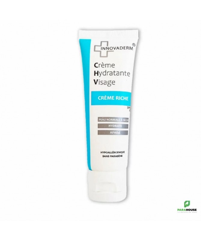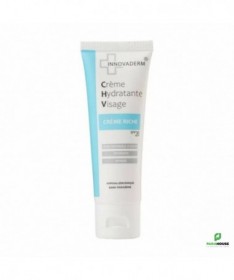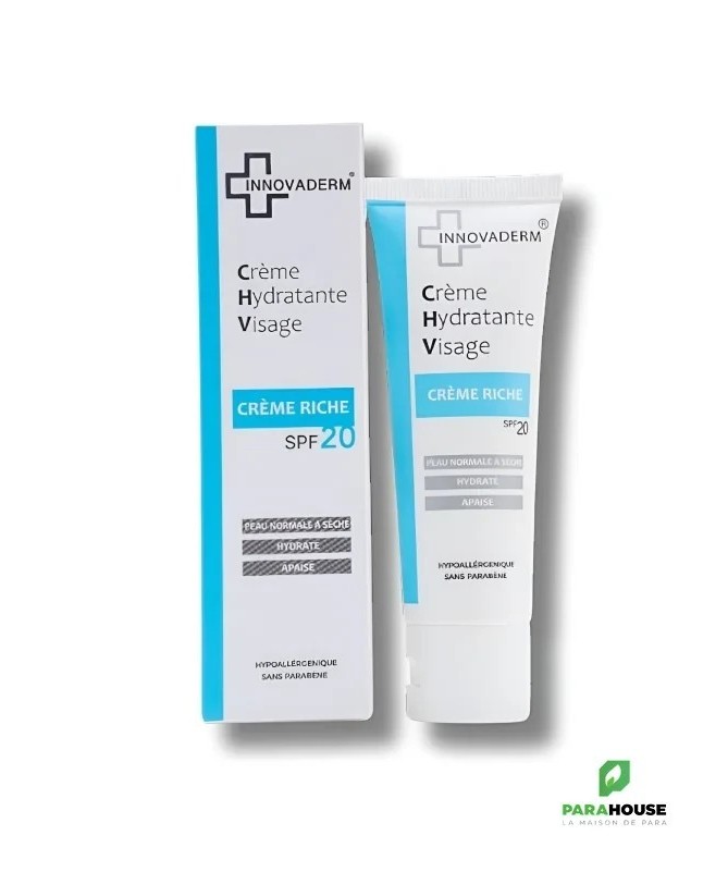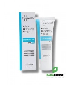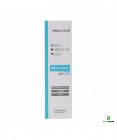 INNOVADERM CREME RICHE SPF20 50ML INNOVADERM CREME RICHE SPF20 est spécialement formulée pour répondre aux besoins des peaux sèches. Enrichie en acide hyaluronique, elle offre une hydratation intense à votre peau, lui redonnant souplesse et confort. Sa texture unique, qui s'absorbe rapidement et pénètre en profondeur dans l'épiderme, permet une hydratation profonde et durable. De plus, avec son indice de protection SPF20, cette crème offre une protection solaire efficace contre les rayons UV, aidant ainsi à prévenir les dommages causés par le soleil et le vieillissement prématuré de la peau. Hypoallergénique Sans parabene