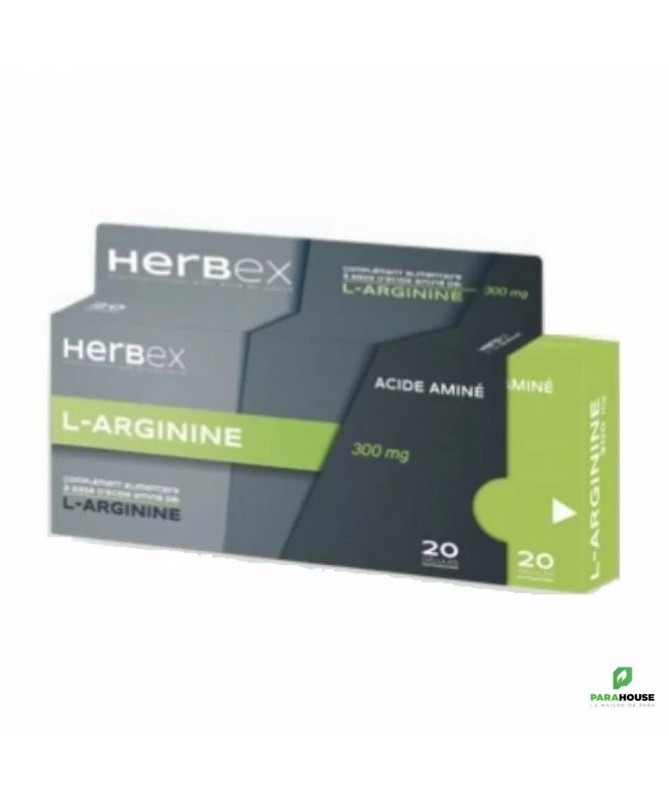 HERBEX L-ARGININE 300MG 20 GELULES HERBEX L-ARGININE est le seul acide aminé capable de fournir du monoxyde d’azote (NO). Elle est un acide aminé semi-essentiel, elle est impliquée dans de nombreux processus tels que : L’amélioration du flux sanguin et l’oxygénation des vaisseaux sanguins coronaires et périphériques grâce à la libération de monoxyde d’azote (NO). la modulation immunitaire la régulation et la réduction de la tension artérielle dans le cycle de l’urée comme précurseur de l’ornithine et de l’urée dans la synthèse de : collagène, élastine, hémoglobine, insuline, glucagon, apo(a) comme médiateur dans la cicatrisation cutanée la réduction de la résistance à l’insuline et l’augmentation de la tolérance au glucose ainsi que la sensibilité à l’insuline• la réduction de la synthèse de cholestérol comme substance stimulant la sécrétion de l’hormone de croissance (hGH) amélioration de mobilité et la qualité des spermatozoïdes . amélioration de la fonction érectile, l’endurance et la performance sexuelle..