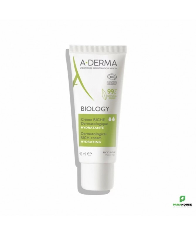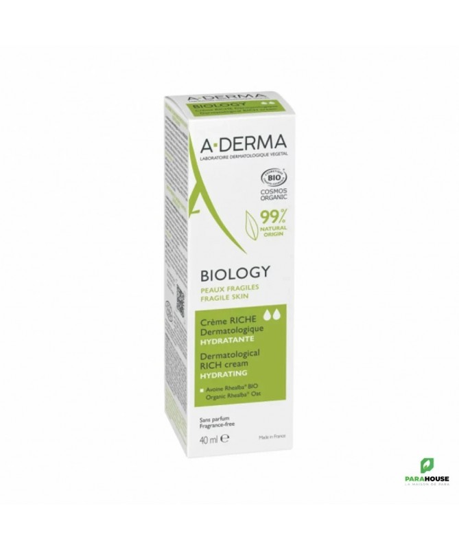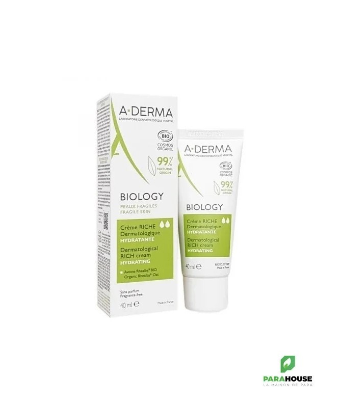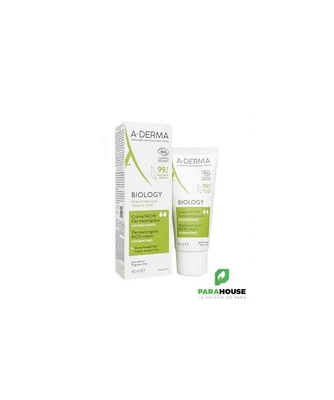 ADERMA BIOLOGY Creme Riche Dermatologique Hydratante 40ML ADERMA BIOLOGY Creme Riche permet de prévenir la sécheresse du sa peau en hydratant 24h¹, rééquilibrant et renforçant les peaux fragiles ou sèches. Développée avec les meilleurs experts du monde entier, cette formule cliniquement prouvée est à la fois dermatologique et certifiée biologique. Notre crème riche innovante dermatologique hydratante pour le visage est spécialement formulée avec la Sève d’Avoine Rhealba® BIO qui rééquilibre et hydrate et l’Extrait de Florin d’Or connu pour son action anti-pollution. Parfaitement hydratée, la peau retrouve équilibre, confort et éclat. A DERMA BIOLOGY Creme Riche offre une hydratation de 24 heures à la peau. La sève aide à restaurer la barrière cutanée et à équilibrer l'épiderme. Efficacité de ADERMA BIOLOGY Creme Riche Dermatologique Hydratante : 24h d'hydratation intense -55% de sécheresse cutanée immédiatement² -100% tiraillements Composition : WATER (AQUA). CAPRYLIC/CAPRIC TRIGLYCERIDE. GLYCERIN. CETEARYL ALCOHOL. PENTYLENE GLYCOL. BEHENYL ALCOHOL. ARGANIA SPINOSA KERNEL OIL*. CETEARYL GLUCOSIDE. CITRUS AURANTIUM DULCIS (ORANGE) FRUIT WATER (CITRUS AURANTIUM DULCIS FRUIT WATER)*. GLYCERYL STEARATE. ALOE BARBADENSIS LEAF JUICE POWDER*. AVENA SATIVA (OAT) FLOWER/LEAF/STEM JUICE (AVENA SATIVA FLOWER/LEAF/STEM JUICE)*. CITRIC ACID. GLYCERYL CAPRYLATE. HELIANTHUS ANNUUS (SUNFLOWER) SEED OIL (HELIANTHUS ANNUUS SEED OIL). SODIUM BENZOATE. TARAXACUM OFFICINALE (DANDELION) RHIZOME/ROOT EXTRACT (TARAXACUM OFFICINALE RHIZOME/ROOT EXTRACT). TOCOPHEROL. XANTHAN GUM 99% d'ingrédients d'origine naturelle. Extrait d'Avoine Rhealba® BIO. Certifié COSMOS ORGANIC Sans parfum Sans huile essentielle Non comédogène Conseils d'utilisation : Il est conseillé d'appliquer biology a derma creme riche matin et/ou soir sur peau nettoyée. Visage et cou.