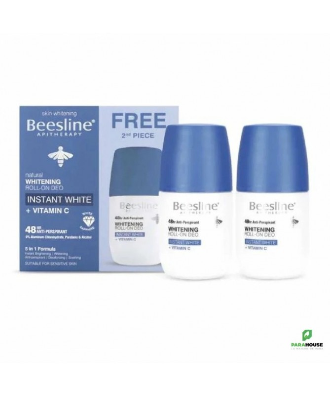 2X BEESLINE DEODORANT ECLAIRCISSANT INSTANT WHITE ( 1 OFFERT ) BEESLINE DEODORANT ECLAIRCISSANT INSTANT WHITE VITAMINE C est un deodorant innovant, sûr et très efficace pendant 72 heures, sans chlorhydrate d'aluminium. BEESLINE DEODORANT ECLAIRCISSAN agit pour combattre les odeurs corporelles, réduire la transpiration, apaiser les aisselles et estomper les taches brunes. Renforcé de saphir blanc pour illuminer instantanément les aisselles. Formule naturelle à base de pierre d'alun, de vitamine C, de propolis et d'aloe vera Très efficace avec jusqu'à 48 heures de protection anti-transpirante Conçu pour estomper les taches brunes et unifier le teint Avec saphir blanc pour illuminer instantanément les aisselles 0 % de chlorhydrate d'aluminium, 0 % de parabènes et sûr à utiliser