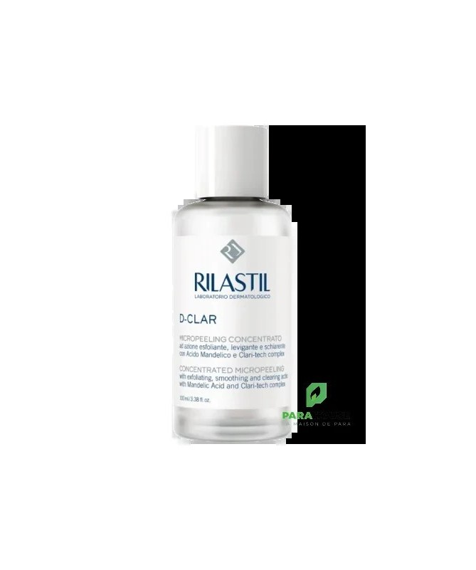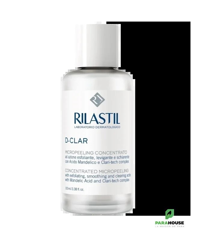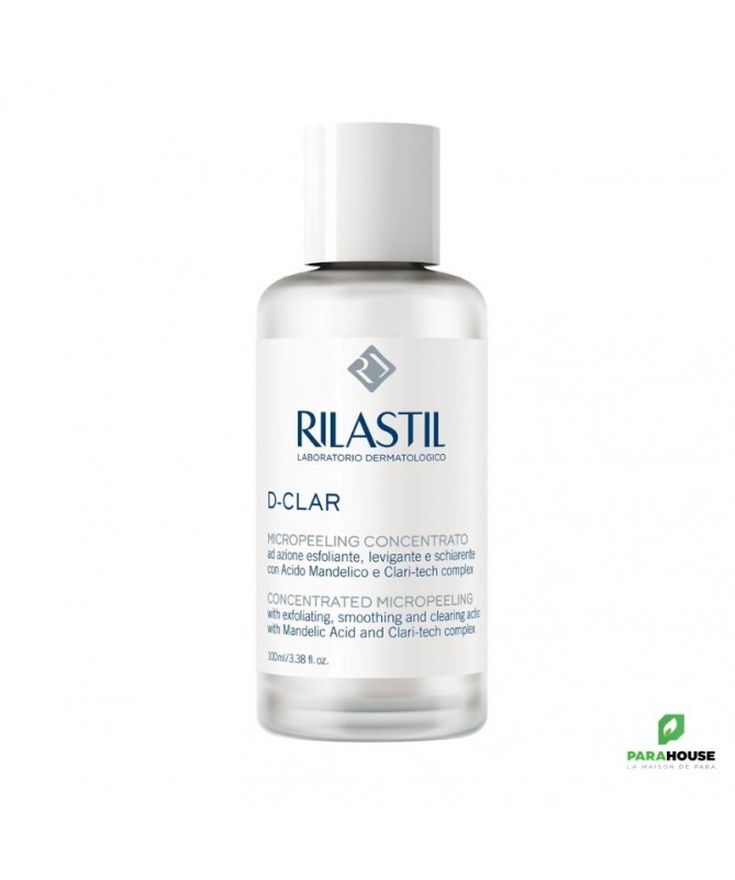 Description :D-Clar Micro peeling est un traitement exfoliant et lightem intensif indiqué pour réduire l’apparence des taches brunes.Rilastil D-Clar Micro peeling 100ml est une lotion biphasique qui aide à dépigmenter les imperfections. Formulée avec de l’acide mandélique qui active le renouvellement cellulaire avec un effet exfoliant et le complexe clari-tech, qui aide à dépigmenter la peau et à minimiser l’apparition de nouvelles taches.Convient à tous les types de peau, même les plus sensibles.Rilastil D-Clar Concentrated Micro peeling 100ml est un exfoliant intensif qui cible l’hyperpigmentation et le teint globalement irrégulier. Il le fait en accélérant le renouvellement cellulaire et en produisant un effet éclaircissant.Grâce à sa formule biphasique, ce produit est capable de pénétrer profondément la peau en offrant une action réparatrice et nourrissante. De plus, ce type de formulation améliore également la tolérance du produit.De plus, cette composition fait partie de la gamme D-Clar de Rilastil. Cette gamme de formules a été spécialement développée pour traiter l’excès de pigmentation causé par une production accrue de mélanine ou par sa répartition inégale.Par conséquent, ces produits de dépigmentation sont idéaux pour cibler des problèmes tels que les taches solaires, le mélasma, les cicatrices d’acné, les hyperchromies post-inflammatoires ou le teint globalement irrégulier.Pour obtenir des résultats optimaux, utilisez-le micro peeling concentré Rilastil D-Clar avec d’autres produits de la même gamme, pour un traitement complet.Conseils D’utilisation :Applique le soir directement avec les mains ou un disque de coton, en effectuant un massage circulaire.En cas de peau sensible, rincer après 3 à 5 minutes.Composition :Aqua (Water), Glycerin, Glycolic Acid, Arbutin, Niacinamide, Lactic Acid, Vitamin C (Ascorbic Acid), et autres actifs éclaircissants, exfoliants et apaisants.