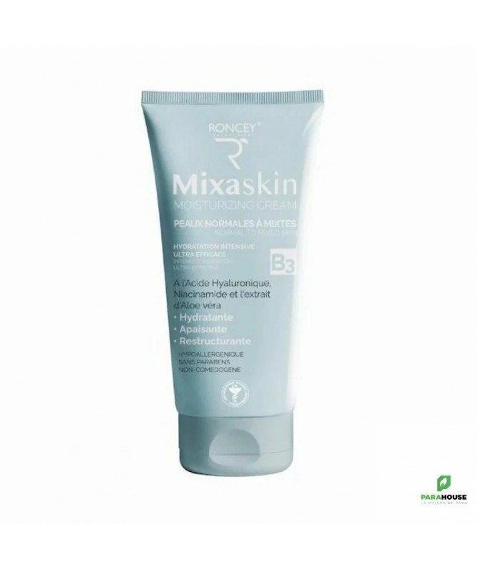 RONCEY MIXASKIN CREME HYDRATANTE PEAU MIXTE 50ML RONCEY MIXASKIN CREME HYDRATANTE PEAU MIXTE est spécialement formulée pour répondre aux besoins spécifiques des peaux mixtes. Grâce à son complexe d'actifs puissants incluant Acide Hyaluronique et Niacinamide, cette crème hydratante intense apaise, restructure et régule l'hydratation dès la première application. Une sensation de confort immédiat et une peau visiblement plus saine . Sa texture légère, non grasse et rapidement absorbée, offre un fini mat et soyeux idéal pour celles et ceux qui recherchent une hydratation efficace sans luisances. Cette crème hydratante convient parfaitement aux adultes et adolescents aux peaux mixtes ou normales cherchant une hydratation quotidienne performante. C'est le soin idéal pour celles et ceux qui souhaitent prévenir les signes de vieillissement tout en maintenant un équilibre hydrique parfait. Les bienfaits de MIXASKIN CREME HYDRATANTE : En optant pour cette crème hydratante, vous choisissez une solution multi-bénéfiques : Hydratation 24H Intensive : L'Aquaxyl et l'Acide Hyaluronique garantissent une hydratation prolongée dans toutes les couches de la peau. Effet Apaisant Immédiat : Le Panthenol et l'Aloe Vera calment instantanément la peau et réduisent les risques d'irritations. Action Restructurante et Anti-Âge : La Niacinamide et le Biosaccharide Gum-1 stimulent le collagène et atténuent les ridules. Texture Non Grasse et Pénétration Rapide : Formule légère qui ne laisse pas de film gras, idéale sous le maquillage. Formule Sûre et Respectueuse : Sans parabènes, non comédogène et hypoallergénique pour une tolérance maximale. Cette crème hydratante est le partenaire idéal pour plusieurs types de préoccupations cutanées. Spécialement conçue pour : Les peaux mixtes (zone T grasse, joues normales à sèches) Les peaux normales nécessitant une hydratation quotidienne Les peaux sensibles cherchant un soin hypoallergénique Composition : AQUA/ WATER, GLYCERIN, STEARIC ACID, CETEARYL ALCOHOL, NIACINAMIDE (VITAMIN B3), AQUAXYL (XYLITYLGLUCOSIDE, ANHYDROXYLITOL, XYLITOL), PROPYLENE GLYCOL, BIOSACCHARIDE GUM-1, BUTYROSPERMUM PARKII (SHEA) BUTTER, PRUNUS AMYGDALUS DULCIS OIL, ISOPROYL MYRISTATE, SILICA, PANTHENOL (VITAMIN B5), PHENOXYETHANOL AND ETHYLHEXYL GLYCERINE, ALOE BARBADENSIS EXTRACT, HYALURONOIC ACID, TOCOPHERYL ACETATE (VITAMIN E), ACRYLATE/ACRYLAMIDE COPOLYMER, TRIETHANOLAMINE, CETEARETH 25, SODIUM BENZOATE, POLYSORBATE 20, DISODIUM EDTA, POLYSORBATE 85, MINERAL OIL, FRAGRANCE. HYPOALLERGENIQUE SANS PARABENS NON-COMEDOGENE Conseils d'utilisation : Il est recommandé de l’utiliser le matin et le soir de manière quotidienne. Une application prolongée dans le temps, sur une durée d’au moins 4 semaines, permet d’optimiser les effets de la crème. Absorption rapide. Fini non collant. Non comédogène.