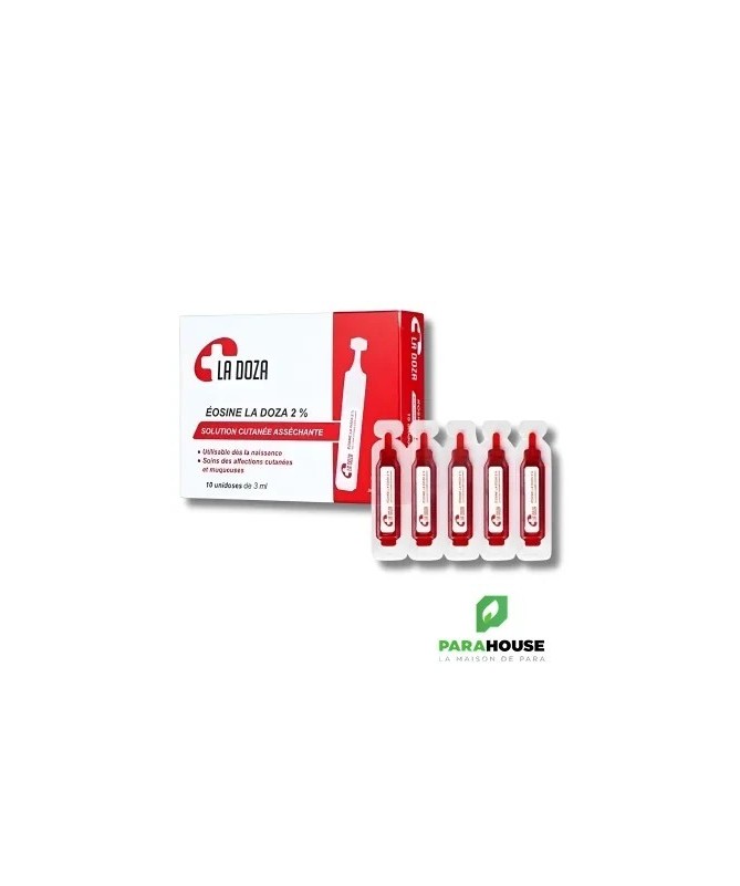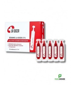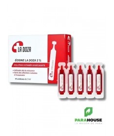 OCULUS Eosine La Doza 2%OCULUS Eosine La Doza 2% est une solution antiseptique destinée au traitement local des affections cutanées bénignes. Présentée en unidoses stériles de 3 ml, elle assure une application hygiénique et précise, sans risque de contamination.IndicationsAssèche les lésions superficielles, telles que irritations, érythèmes ou petits suintements.Nettoie et protège la peau susceptible de se surinfecter.Idéale pour les nouveau-nés : cordon ombilical et érythème fessier.PraticitéChaque boîte contient 10 unidoses stériles de 3 ml.Facile à utiliser à domicile ou en déplacement.