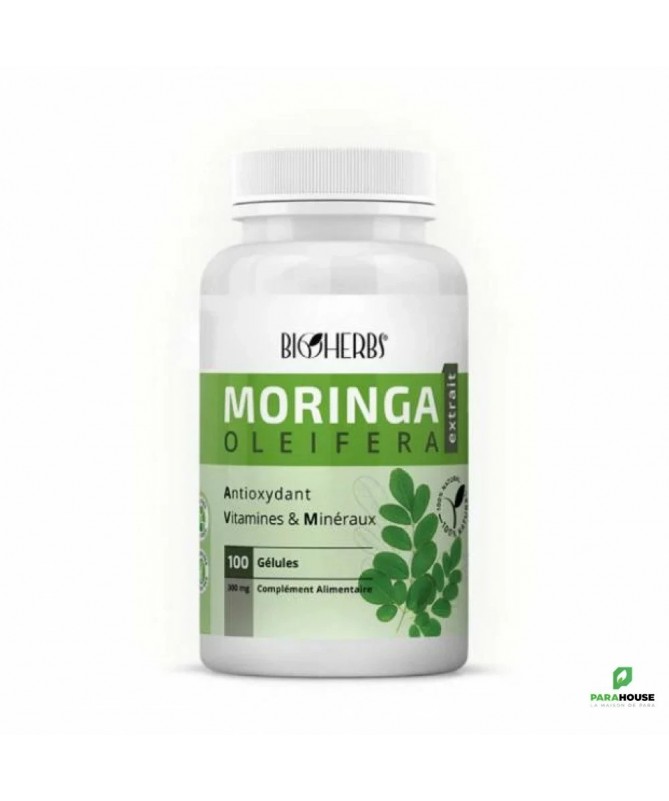 BIOHERBS MORINGA 100 GELULES BIOHERBS MORINGA sont fabriquées à partir des feuilles de Moringa oleifera, un arbre surnommé « l’arbre de vie » en raison de ses propriétés nutritives et médicinales exceptionnelles. Ce complément alimentaire 100 % naturel est conditionné sous forme de gélules, pour une absorption optimale par l’organisme. Chaque flacon contient 100 gélules, soit une autonomie d’environ 30 jours, pour une cure revitalisante et complète. Le Moringa est reconnu comme un super-aliment grâce à sa composition riche en protéines végétales, vitamines (A, C, E), minéraux (calcium, potassium, fer) et acides aminés essentiels. Il constitue un choix judicieux pour les personnes souhaitant compléter leur alimentation de manière saine et naturelle, sans produits chimiques ni additifs. Avantages Clés de BIOHERBS MORINGA Renforce le système immunitaire : Grâce à sa teneur élevée en vitamine C et en antioxydants, le Moringa aide votre corps à se défendre contre les infections et les agressions extérieures. Améliore les fonctions cognitives : Les acides aminés et les vitamines du groupe B contenus dans le Moringa participent au bon fonctionnement du cerveau et aident à maintenir la concentration et la mémoire. Anti-âge naturel : Riche en antioxydants (vitamine E, polyphénols), le Moringa protège vos cellules contre le stress oxydatif et ralentit le vieillissement cutané. Soutien la santé cardiovasculaire : Contribue à réguler la tension artérielle et à réduire le taux de mauvais cholestérol (LDL), un atout pour prévenir les problèmes cardiaques. Aide à réguler la glycémie : Des études montrent que le Moringa peut aider à stabiliser le taux de sucre dans le sang, bénéfique en cas de diabète ou de pré-diabète. Action anti-inflammatoire et antalgique : Soulage naturellement les douleurs articulaires et les inflammations légères. Composition : Moringa 300mg Conseils d'utilisation : Quand prendre? Après les repas Combien de gélule ? 2 à 3 gélules par jour Comment prendre ? À prendre avec un grand verre d'eau Durée d'un flacon ? 30 jours Déconseillé aux femmes enceintes et allaitantes, ainsi que personnes souffrant d’hypoglycémie ou personnes diabétiques insulinodépendantes Ne pas dépasser les doses journalières indiquées Ne doublez jamais une dose pour compenser une dose oubliée Si vous oubliez de prendre une dose, prenez-la le plus tôt possible, sauf si c'est près de l'heure de la dose suivante, alors la dose oubliée sera sautée et la dose suivante sera prise à l'heure spécifiée Les compléments alimentaires ne peuvent en aucun cas se substituer à une alimentation variée et équilibrée Si vous suivez un traitement médical, il est indispensable de demander conseil à un professionnel de la santé Conserver dans un endroit sec, à l'abri de l'humidité, à une température inférieure à 25° C et hors de portée des enfants.