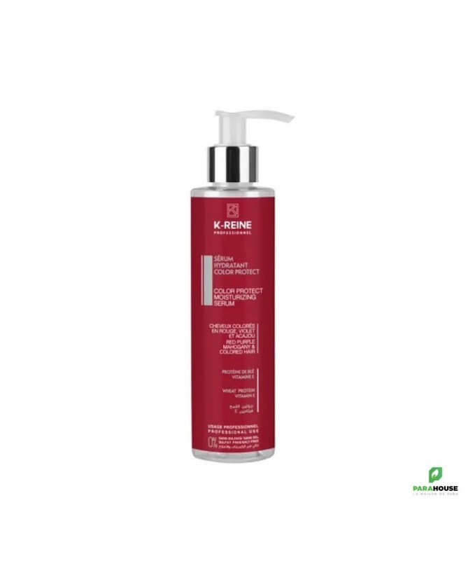 K-REINE SERUM HYDRATANT COLOR PROTECT 100ML K-REINE SERUM HYDRATANT COLOR PROTECT est conçu pour protéger la splendeur des cheveux colorés et prolonger la durée de la teinture. Enrichi en vitamine E et à la protéine de blé connues pour leurs propriétés antioxydantes, protègent les cheveux contre les radicaux libres générés par les UV et la chaleur (fer à lisser, brushing, soleil, etc…), il limite ainsi le délavage de la couleur et prolonge son éclat. Les cheveux teintés sont ravivés, protégés plus éclatants et lumineux. Les avantages: Protège la couleur des cheveux Hydrate en profondeur les cheveux Nourrit les cheveux avec de la protéine de blé et de la vitamine E Laisse les cheveux doux, brillants et sains Le Sérum Hydratant Color Protect - Protéine De Blé - Vitamine E 100 ml k-reine est un soin capillaire avancé conçu pour hydrater et protéger les cheveux colorés. Sa formule enrichie en protéine de blé et en vitamine E nourrit les cheveux en profondeur tout en préservant l'éclat de la couleur. Ce sérum est un choix parfait pour des cheveux sains, brillants et protégés. Conseils d'utilisation : Appliquez une petite quantité de sérum K REINE SERUM sur les cheveux humides en insistant sur les pointes. Peignez les cheveux pour répartir uniformément le sérum. Ne pas rincer. Utilisez régulièrement pour des résultats optimaux.