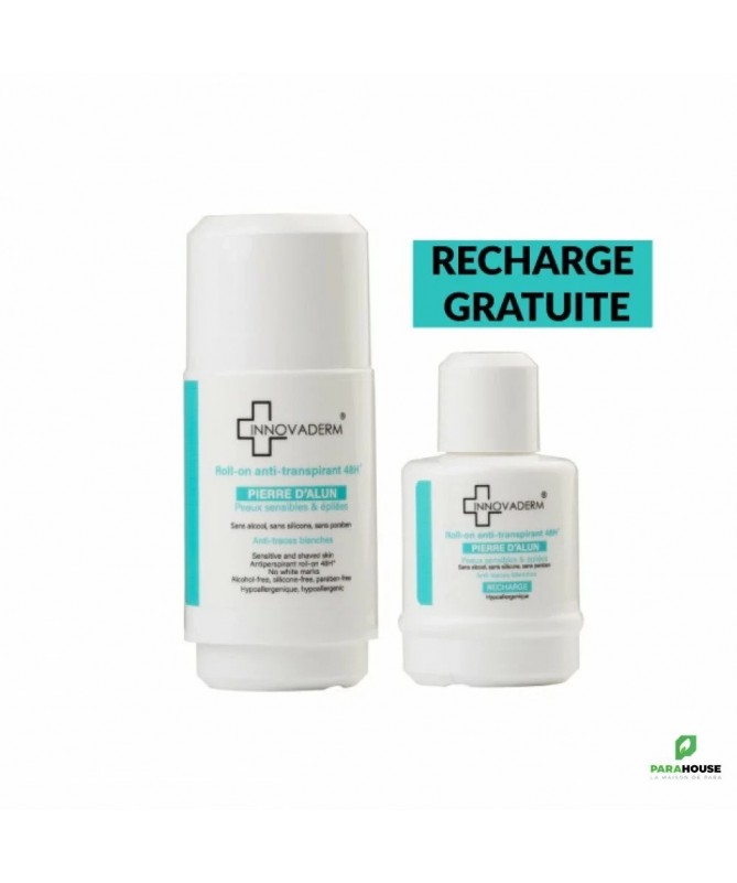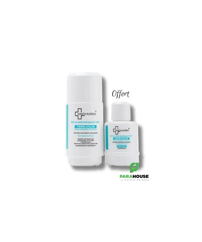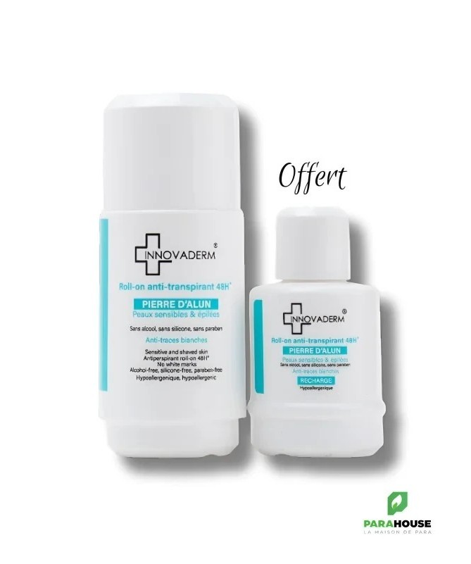 INNOVADERM ROLL ON ANTI TRANSPIRANT + RECHARGE OFFERTE INNOVADERM ROLL ON ANTI TRANSPIRANT : Protection Anti-Transpirante 48H : Garantit une efficacité longue durée contre la transpiration. Formule à Base de Pierre d’Alun : Ingrédient naturellement efficace pour réduire la transpiration. Peaux Sensibles et Épilées : Idéal pour les peaux réactives et récemment épilées. Sans Alcool, Paraben ni Silicone : Formule hypoallergénique pour une utilisation en toute sécurité. Sans Trace sur les Vêtements : Laisse votre peau et vos vêtements parfaitement propres. Recharge Offerte : Bénéficiez d’une recharge gratuite avec l’achat de votre roll-on Pour Qui ? Peaux Sensibles : Formulé pour minimiser les risques d’irritation. Peaux Récemment Épilées ou Rasées : Convient parfaitement pour une utilisation post-épilation ou rasage. Personnes Cherchant une Solution Anti Transpirante Efficace : Idéal pour celles qui souhaitent une protection longue durée. Conseil d'utilisation : Appliquez INNOVADERM Roll On Anti Transpirant 48H sur peau sèche sur les aisselles