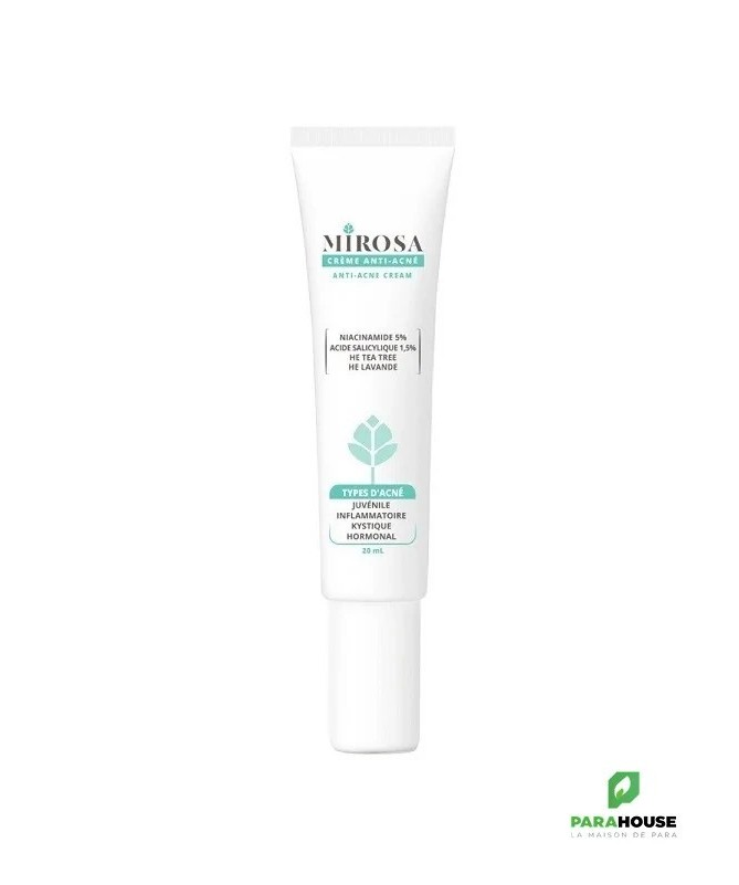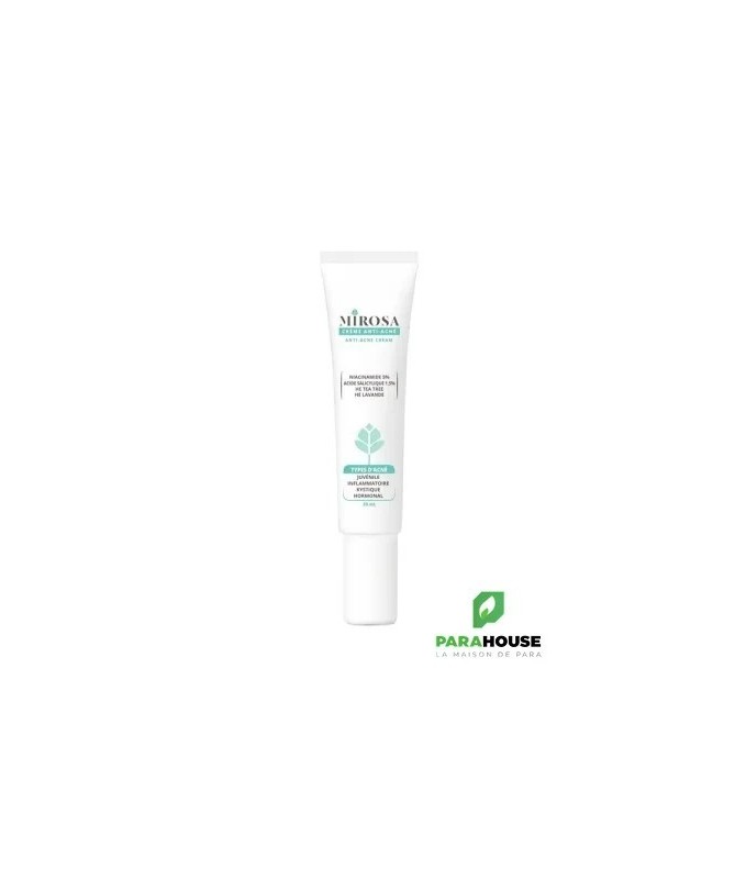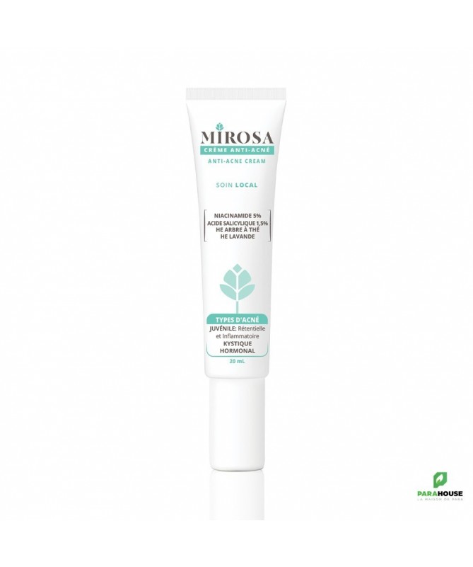 MIROSA CREME ANTI ACNE 20ML MIROSA CREME ANTI ACNE est conçue pour les peaux mixtes/grasses à tendance acnéique. Grâce à sa formule riche en huiles essentielles, vitamines et actifs, ce soin anti-imperfections favorise l’élimination des boutons, régule la sécrétion de sébum et ne laisse pas de film gras sur la peau. Composition : AQUA (purified water), NIGELLA SATIVA SEED OIL, MELALEUCA ALTERNIFOLIA LEAF OIL, LAVANDULA ANGUSTIFOLIA OIL (linalol), LAVANDULA SPICA FLOWER OIL, PELARGONIUM GRAVEOLENS FLOWER OIL, NIACINAMIDE (5%), SALYCILIC ACID, GLYCERYL STEARATE, XANTHAN GUM, TOCOPHEROL, sodium benzoate, potassium sorbate. Conseils d'utilisation : Appliquer MIROSA CREME ANTI ACNE matin et/ou soir sur les zones concernées, seul ou en complément des traitements dermatologique. Effectuer de petits mouvements circulaires pour faire pénétrer les actifs. Ne convient pas aux femmes enceintes et allaitantes. Eviter l’exposition au soleil. Eviter le contour des yeux. Usage externe.