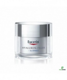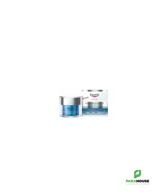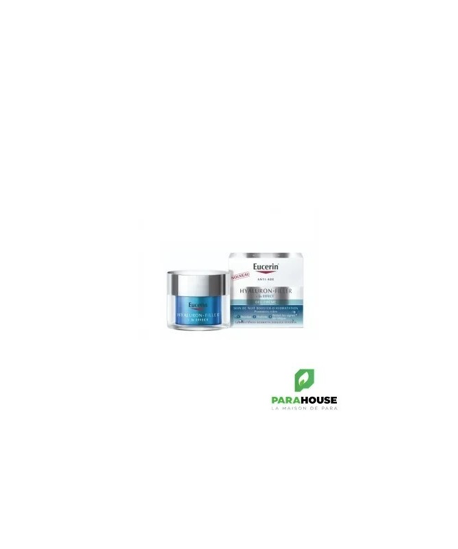 Eucerin Hyaluron-filler +3X Effect Soin Nuit Booster Hydratation à la texture gel-crème ultra légère est idéal pour les premiers signes de l’âge. Il repulpe donc les premières rides, hydrate intensément la peau et réduit les signes de fatigue. Il combine de l’Acide Hyaluronique de haut poids moléculaire. Ce qui fixe l’eau au niveau de la surface de la peau, et de l’Acide Hyaluronique de bas poids moléculaire, et qui pénètre plus en profondeur de l’épiderme. Contenant également de la Glycérine, la formule hydrate intensément et significativement la peau. La ProVitamine B5 régénère activement et renforce la peau durant la nuit, tandis que la Vitamine E protège la peau du stress oxydatif. La combinaison d’ingrédients procure une peau à l’apparence fraîche, saine, moins fatiguée et qui semble plus résistante au toucher. La peau est intensément hydratée pendant la nuit et jusqu’à 72h. Pour une peau radieuse chaque jour. Propriétés Eucerin Hyaluron-filler +3X Effect Soin Nuit Booster Hydratation est en gel-crème avec une texture ultra-légère 1. Repulpe les ridules et les premières rides. 2. Hydrate intensément jusqu’à 72h. 3. Réduit les signes de fatigue 95% des femmes le constatent : la peau paraît plus fraîche et plus jeune au réveil*. (*Test consommateurs, 160 femmes, 2 semaines, % de satisfaction.) Cette formule, à la texture ultra légère et efficace pendant la nuit, combine de l’Acide Hyaluronique de haut poids moléculaire, qui fixe l’eau au niveau de la surface de la peau, et de l’Acide Hyaluronique de bas poids moléculaire, qui pénètre plus en profondeur de l’épiderme. Contenant également de la Glycérine, la formule hydrate intensément et significativement la peau. La ProVitamine B5 régénère activement et renforce la peau durant la nuit, tandis que la Vitamine E protège la peau du stress oxydatif. Conseils d’utilisation