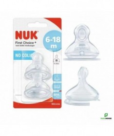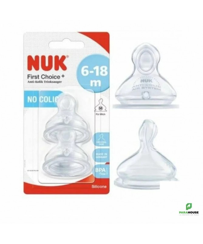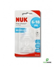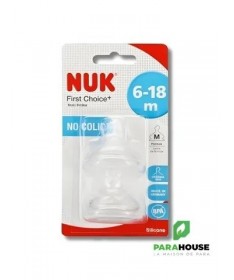 NUK FIRST CHOICE Tetine 6-18 M LOT 2 NUK FIRST CHOICE Tetine 6-18 M offre à bébé une tétée proche de l’allaitement maternel tout en intégrant un système de ventilation Air System réduisant les risques de coliques et les hoquets. Elle est encore plus souple grâce à la nouvelle « Soft Zone ». Tétine en silicone ventilée anti-colique. La base élargie de la tétine first choice reproduit également la position naturelle de succion Réduit les risques de coliques et favorise la digestion Valve air system régule l’entrée d’air dans le biberon et réduit ainsi l’absorption d’air Favorise une bonne formation de la mâchoire : Forme physiologique recommandée par l’union française pour la santé bucco-dentaire (ufsbd) La partie plate fortifie la langue du nouveau-né pour une poussée saine des dents de lait