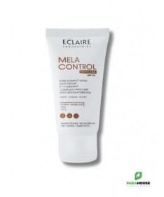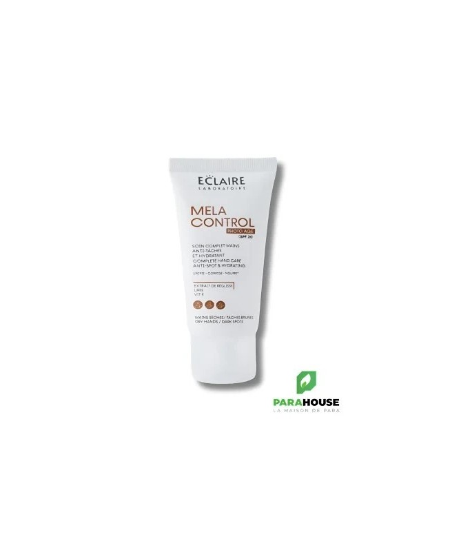 ECLAIRE MELA Control - Crème Mains SPF20 Anti-Âge Anti-Taches 50 mlLaCrème Mains ECLAIRE MELA Controlest spécialement formulée pour protéger et nourrir les mains tout en luttant contre les signes du vieillissement cutané et les taches pigmentaires. Enrichie en filtres solaires SPF20, elle protège la peau des agressions quotidiennes et des rayons UV responsables du vieillissement prématuré.BienfaitsHydrate intensément et nourrit la peau sèche des mains.Réduit l’apparence des taches pigmentaires et uniformise le teint.Lutte contre les signes de l’âge grâce à sa formule anti-âge.Protège la peau des rayons UV avec un SPF20 intégré.Texture légère et non grasse, rapidement absorbée.Conseils d’utilisationAppliquer quotidiennement sur les mains propres et sèches.Renouveler l’application après le lavage des mains ou l’exposition au soleil.Peut être utilisée à tout moment de la journée pour une protection continue.Convient à :Personnes souhaitant protéger leurs mains, prévenir les taches pigmentaires et réduire les signes du vieillissement cutané.
