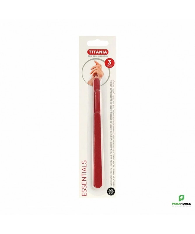 TITANIA Set de 3 Limes - 1042 SET TITANIA Set de 3 Limes est un ensemble de limes à ongles flexibles double face sur une base en carton Titania, de différentes longueurs (3 pièces par paquet) pour limer et polir les ongles, de dureté douce à moyenne (grain 120/150). Convient à la fois aux revêtements naturels et en gel, vous pouvez facilement prendre soin de vos ongles avec. L'ensemble de limes à ongles Titania contient trois outils à double face. Ils diffèrent par leur longueur et leur degré de rigidité (grain 150/120/100). Ces limes peuvent être utilisées sur les revêtements naturels et en gel.