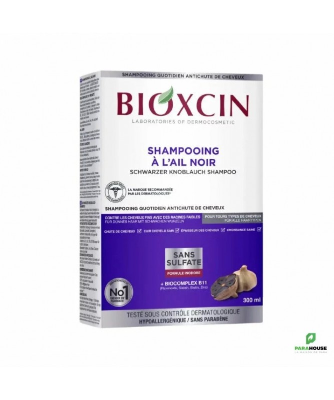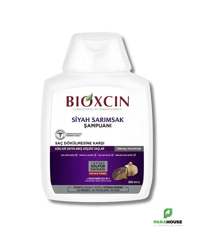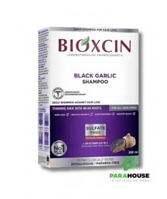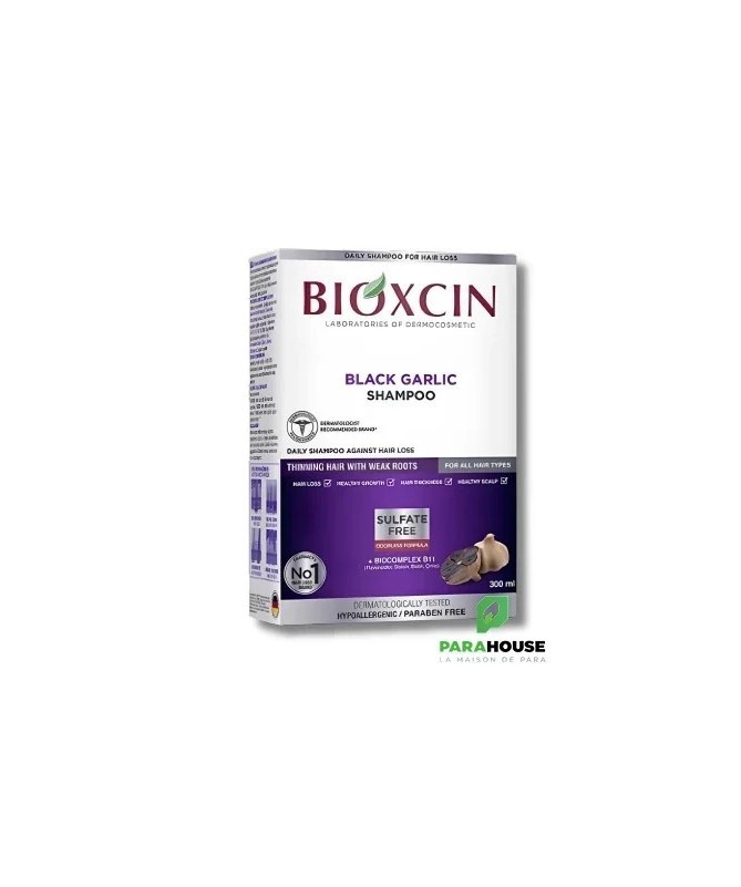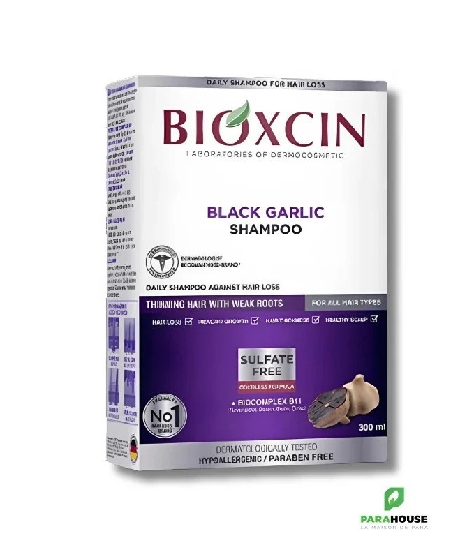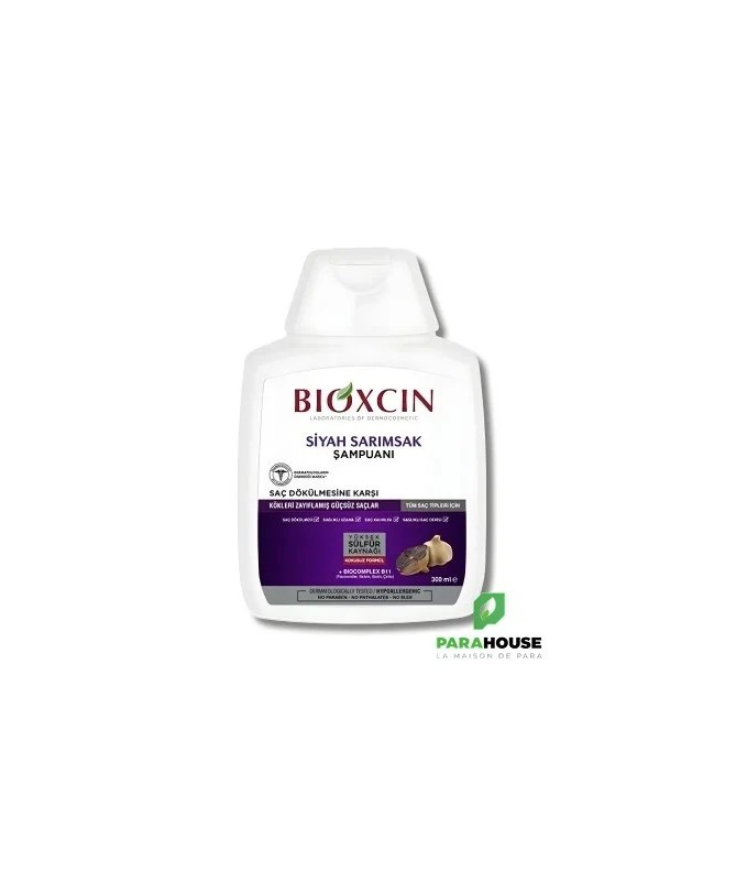 BIOXCIN Shampooing Anti Chute à l'Ail Noir 300ML BIOXCIN Shampooing à l'Ail Noir contient 100% d'extrait d'ail noir et riche en actifs offrant un soin complet aux cheveux. Il apporte multiples effets : ajoute du volume, de la vitalité et de la brillance aux cheveux. BIOXCIN Shampooing Ail Noir présente une solution efficace aux problèmes de cheveux et de cuir chevelu, y compris la perte de cheveux. Avec sa formule Biocomplex B11, il augmente la croissance des follicules pileux et renforce l'épaisseur des cheveux. L'ail noir présent dans sa composition, a une capacité antioxydante plus élevée que l'ail blanc et rend les cheveux plus épais. Composition: BIOCOMPLEX B11 : Contient des flavonoïdes, des vitamines et des minéraux et aide à prévenir la chute des cheveux en nourrissant les cheveux • Vitamines (A, B1, B2, B5, B9): Aide à renforcer les mèches de cheveux. • Minéraux (Cuivre, Zinc, Fer, Calcium): Il nourrit les cheveux. • Flavonoïdes (Kemferol, Apigénine, Myricétine): Protège les mèches de cheveux des dommages. • Acides Gras Insaturés (Oméga-6, Oméga-9): Il est efficace contre la chute des cheveux. PEPTIDES BIO-ACTIV : C'est un équivalent actif des peptides présents dans les cheveux humains et contient des peptides spécifiques des couches du cortex et de la cuticule. EXTRAIT D'AIL NOIR : t efficace contre la chute des cheveux. Répare les cheveux abîmés et ajoute vitalité et brillance aux cheveux. KÉRATINE (LAURDIMONIUM HYDROXYPROPYL HYDROLYZED KERATIN (KERESTORETM2.0) : démêle les cheveux et fournit une réparation ciblée des zones les plus abîmées de la surface des cheveux. VITAMINE B3 (niacinamide) : a des effets positifs sur la partie cutanée en termes de tissu conjonctif et de composants de matrice de gel. EXTRAIT DE SARMAŞIK (HEDERA HELIX) : aide également les cheveux à pousser sainement. Miel : a des propriétés antibactériennes, antifongiques et nourrissantes pour la peau. Sans paraben. Sans sulfates. Sans colorants. Conseils d'utilisation: Il est conseillé d'appliquer BIOXSINE Shampooing Anti-Chute à l'Ail Noir sur cheuveux mouillés en massant.