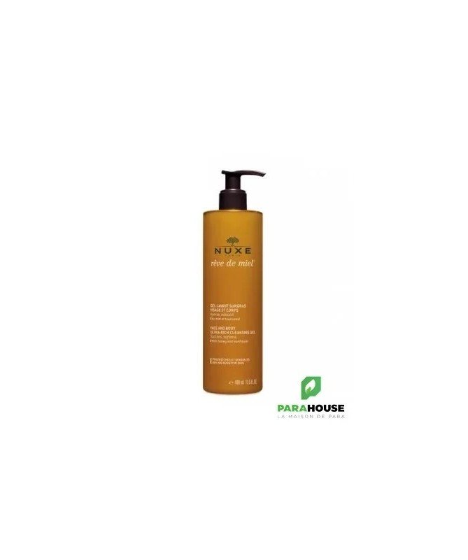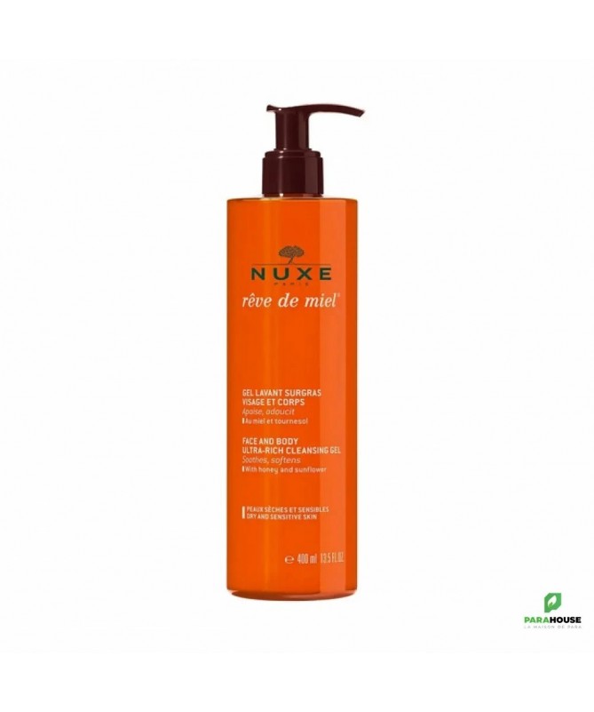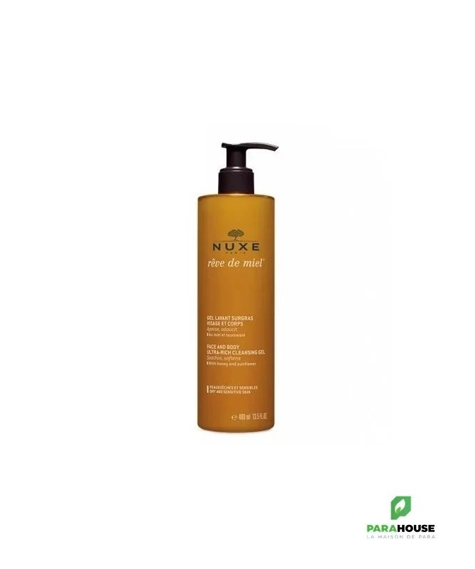 Nuxe Reve de miel Gel nettoyant SURGRAS 400ML Nuxe Reve de miel Gel nettoyant SURGRAS est un démaquillant doux au Miel et Tournesol nettoie, apaise et démaquille en un seul geste, tout en douceur. Un régal des sens pour une belle peau. Résultats : Nettoie sans dessécher pour 91% des volontaires dès la 1ère application Peau plus confortable pour 100% des volontaires dès la 1ère application Composition : Principaux actifs d'origine naturelle : Miel, Tournesol, Coco, Allantoïne... Contient 92 % d'ingrédients d'origine naturelle AQUA/WATER, GLYCERIN, SODIUM COCOAMPHOACETATE, SODIUM LAUROYL SARCOSINATE, LAURYL GLUCOSIDE, PARFUM/FRAGRANCE, MEL/HONEY, SUNFLOWER SEED OIL PEG-8 ESTERS, SODIUM COCOYL GLUTAMATE, SODIUM LAURYL GLUCOSE CARBOXYLATE, ACRYLATES/C10-30 ALKYL ACRYLATE CROSSPOLYMER, PHENOXYETHANOL, GLUCONOLACTONE, SODIUM HYDROXIDE, COCO-GLUCOSIDE, GLYCERYL OLEATE, CITRIC ACID, ALLANTOIN, SODIUM BENZOATE, TETRASODIUM GLUTAMATE DIACETATE, 1,2-HEXANEDIOL, CAPRYLYL GLYCOL, CARAMEL, CALCIUM GLUCONATE, TROPOLONE, HYDROGENATED PALM GLYCERIDES CITRATE, TOCOPHEROL [N2002/A]. CONSEILS D'utilisation Il est recommandé d'Utiliser NUXE le Gel Nettoyant et Démaquillant Visage matin et/ou soir, masser sur une peau humide, faire mousser puis rincer à l'eau claire. Eviter le contact avec les yeux.