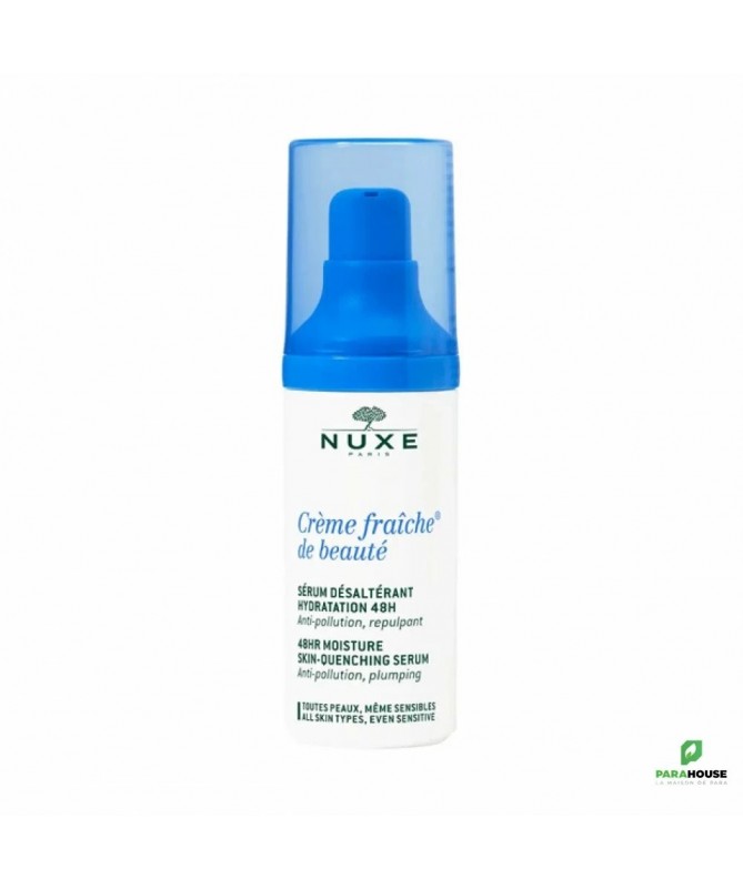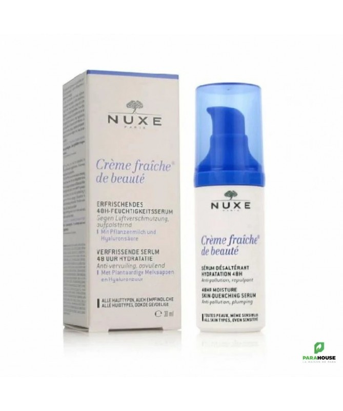 NUXE CREME FRAICHE DE BEAUTE SERUM 30ML NUXE CREME FRAICHE DE BEAUTE SERUM est un soin spécialement conçu pour limiter la perte d'éclat et de confort et les sensations intenses et persistantes de tiraillements. Parfait de par sa texture gel-crème extrêmement rafraîchissante, NUXE Crème Fraîche de Beauté Sérum Désaltérant assure une hydratation intense et une protection de la peau contre la pollution extérieure. Sa composition en Laits végétaux et Acide Hyaluronique ravive repulpe les peaux les plus ternes. Composition Composants d'origine naturelle : Extrait d'Algue High-Tech** boosté, Allantoïne, Acide Hyaluronique d'origine naturelle, Laits végétaux, Fleurs Blanches d'Amandier et d'Oranger. 96.4 % du total des ingrédients sont d'origine naturelle AQUA/WATER, GLYCERIN,XYLITOL, LAUROYL LYSINE, MACADAMIA INTEGRIFOLIA SEED OIL, SILICA, XYLITYLGLUCOSIDE, PARFUM/FRAGRANCE, SQUALANE, ANHYDROXYLITOL, HYDROXYETHYL ACRYLATE/SODIUM ACRYLOYLDIMETHYL TAURATE COPOLYMER, PHENOXYETHANOL, ETHYLHEXYLGLYCERIN, TOCOPHEROL, SODIUM HYALURONATE, DEHYDROACETIC ACID, ALLANTOIN, SODIUM GLUCONATE, ACRYLATES/C10-30 ALKYL ACRYLATE CROSSPOLYMER, POLYSORBATE 60, SORBITAN ISOSTEARATE, SODIUM HYDROXIDE, HELIANTHUS ANNUUS (SUNFLOWER) SEED OIL, SODIUM CARRAGEENAN, GLYCINE SOJA (SOYBEAN) OIL, CAMELLIA OLEIFERA SEED OIL, CAPRYLOYL GLYCINE, CITRUS AURANTIUM DULCIS (ORANGE) FLOWER EXTRACT, PRUNUS AMYGDALUS DULCIS (SWEET ALMOND) OIL, GLYCINE SOJA (SOYBEAN) SEED EXTRACT, PISUM SATIVUM (PEA) EXTRACT, DISODIUM EDTA, AVENA SATIVA (OAT) KERNEL EXTRACT, MARIS SAL/SEA SALT,PRUNUS AMYGDALUS DULCIS (SWEET ALMOND) FLOWER EXTRACT,CAMELLIA SINENSIS LEAF EXTRACT, PRUNUS AMYGDALUS DULCIS (SWEET ALMOND) FRUIT EXTRACT, ROBINIA PSEUDOACACIA FLOWER EXTRACT, COCOS NUCIFERA (COCONUT) FRUIT EXTRACT, LINALOOL, GERANIOL, LIMONENE [N3605/A], SCLEROTIUM GUM Conseils d'utilisation Il est recommandé d'appliquer NUXE Crème Fraîche de Beauté Sérum et/ou le soir sur le visage. Pour plus d'éfficacité, il est conseillé d'utiliser le masque hydratant Crème Fraîche® de Beauté 1 à 2 fois par semaine, sur le visage et le cou