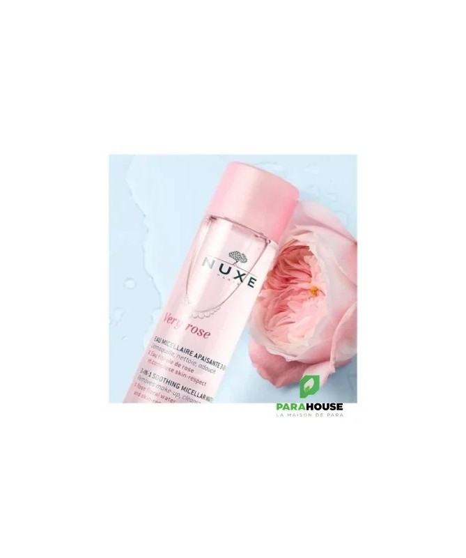 Découvrez l'eau micellaire apaisante 3 en 1 NUXE VERY ROSE, un soin délicat conçu pour nettoyer, démaquiller et apaiser votre peau en un seul geste. Formulée avec des extraits de rose, cette eau micellaire offre une sensation de fraîcheur et de douceur, tout en respectant les peaux les plus sensibles. Grâce à sa texture légère, elle élimine efficacement les impuretés et le maquillage, laissant votre visage parfaitement propre et revitalisé. Idéale pour un usage quotidien, elle convient à tous les types de peau. Incorporer NUXE VERY ROSE dans votre routine de soins, c'est faire le choix d'un produit qui allie efficacité et douceur. Offrez à votre peau le soin apaisant qu'elle mérite et révélez un teint lumineux et sain. Avec son flacon de 200 ml, cette eau micellaire est votre alliée indispensable pour un démaquillage rapide et agréable.incipe des micelles, des agrégats moléculaires qui ont la particularité d'être hydrophile d'un côté et hydrophobe de l'autre, ce qui leur permet de capturer les résidus gras de maquillage ainsi que les impuretés avant de se déposer sur le coton pendant le démaquillage. Cette action a pour avantage de ne pas abraser le peau qui conserve une grande douceur, même après le passage du coton.Conseils d'utilisation:Appliquez matin et soir à l'aide d'un coton sur le visage et autour des yeux,Sans rinçageComposants :Aqua/Water, Glycerin, PEG-6 Caprylic/Capric Glycerides, Pentylene Glycol, Rosa Damascena Flower Water, Parfum/Fragrance, Sodium Gluconate, Cetrimonium Bromide, Xylitylglucoside, Anhydroxylitol, Xylitol, Citric Acid, Sodium Hydroxide, Phenoxyethanol [N4105/A]