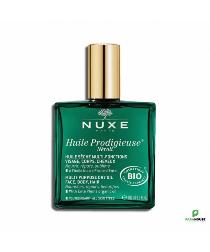 NUXE Huile Prodigieuse Neroli 100ML NUXE Huile Prodigieuse Neroli permet d'embellir votre peau d'un éclat satiné irrésistible sans fini gras grâce à sa texture inimitable au toucher sec, qui nourrit et répare le visage, le corps et les cheveux en un seul geste. En un seul geste, nourrissez, réparez et sublimez la peau de votre visage, de votre corps et vos cheveux. L'Huile Prodigieuse Néroli habille tous les types de peaux d‘un irrésistible éclat satiné. Elle offre une action protectrice anti-pollution et agit sur l'apparence des vergetures. Vos cheveux sont nourris, brillants et protégés des agressions extérieures. Efficacité : Une action protectrice anti-pollution démontrée par un test instrumental. Elle atténue l'apparence des vergetures . Peau nourrie et sublimée pour 97% . Peau plus lumineuse pour 94%. Cheveux sont nourris, brillants et protégés des agressions extérieures. Composition : SESAMUM INDICUM (SESAME) SEED OIL*, COCO-CAPRYLATE/CAPRATE, DICAPRYLYL ETHER, PRUNUS DOMESTICA SEED OIL*, PARFUM/FRAGRANCE, TOCOPHEROL, LINALOOL, LIMONENE, CITRAL, GERANIOL [N2219/A]. Formule vegan, sans ingrédients ni dérivés d‘origine animale. 100 % du total est d‘origine naturelle. 42% du total des ingrédients est issu de l'agriculture biologique Conseils d'utilisation : Appliquez huile prodigieuse neroli sur votre visage et votre corps pour nourrir et adoucir la peau et ajouter un fini satiné. Pour votre visage, mélangez quelques gouttes d'Huile à votre crème NUXE. Massez l'Huile sur vos jambes de bas en haut pour capter la lumière et créer un éclat satiné.