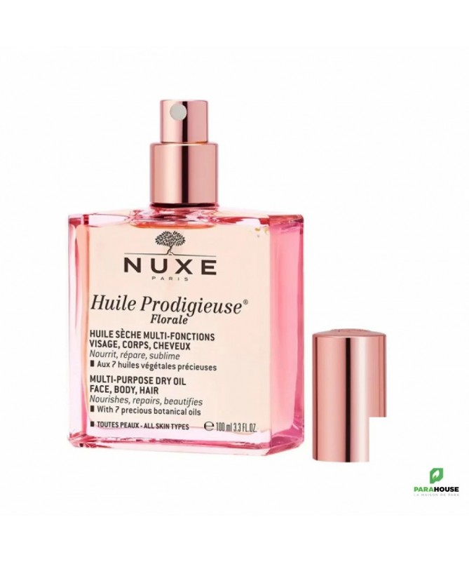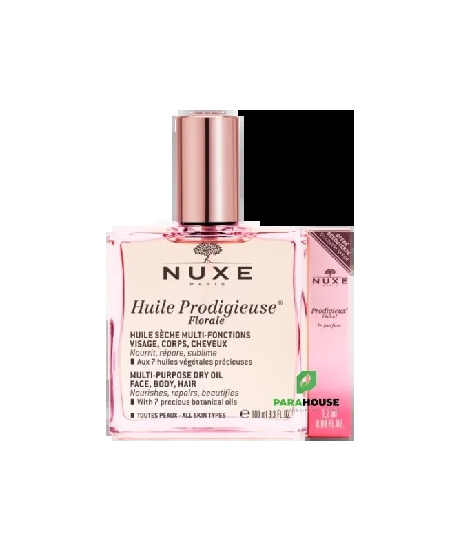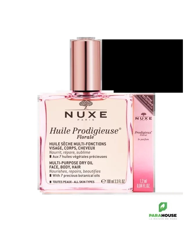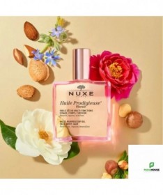 NUXE HUILE PRODIGIEUSE FLORALE 100ML NUXE HUILE PRODIGIEUSE FLORALE aux 7 huiles précieuses 100% végétales se décline dans un nouveau parfum floral et délicat. Cette huile hydratante conserve la même texture huile sèche et la même efficacité sur le corps, le visage et les cheveux. Son action anti-oxydante, son effet "bouclier anti-pollution" et son effet sur la réduction de l'apparence des vergetures en font votre alliée au quotidien. Sa texture huile sèche inimitable dévoile une signature olfactive inédite chez Nuxe, aux notes florales et fraîches pour vivre un nouveau moment de plaisir Résultats : Peau est plus douce pour 100% des femmes après 28 jours Peau nourrie pour 97% des femmes après 28 jours Peau réparée pour 97% des femmes après 28 jour Composition : Principaux actifs d'origine naturelle avec 7 huiles précieuses 100% végétales : huile de Tsubaki hydratante, huile d'Argan réparatrice, huile de Macadamia nourrissante, huile de Bourrache lissante, huile de Camélia hydratante, huile de Noisette protectrice et huile d'Amande douce adoucissante. Parfum floral et délicat aux notes de zeste de Pamplemousse, Magnolia et Musc. COCO-CAPRYLATE/CAPRATE, MACADAMIA INTEGRIFOLIA SEED OIL, DICAPRYLYL ETHER, CAPRYLIC/CAPRIC TRIGLYCERIDE, PRUNUS AMYGDALUS DULCIS (SWEET ALMOND) OIL, CORYLUS AVELLANA (HAZELNUT) SEED OIL, PARFUM/FRAGRANCE, CAMELLIA OLEIFERA SEED OIL, CAMELLIA JAPONICA SEED OIL, TOCOPHEROL, ARGANIA SPINOSA KERNEL OIL, BORAGO OFFICINALIS SEED OIL, TOCOPHERYL ACETATE, HELIANTHUS ANNUUS (SUNFLOWER) SEED OIL,ROSMARINUS OFFICINALIS (ROSEMARY) LEAF EXTRACT, POLYGLYCERYL-3 DIISOSTEARATE, ASCORBIC ACID, AQUA/WATER, LIMONENE, LINALOOL, CITRAL, CITRONELLOL, HYDROXYCITRONELLAL, GERANIOL [N2216/C]. 97% d'ingrédients d'origine naturelle Conseils d'Utilisation : Il est recommandé d'Utiliser NUXE HUILE PRODIGIEUSE FLORALE toute l'année, hiver comme été, sur le visage, le corps et les cheveux. Sur le visage, huile prodigieuse florale s’applique par mouvements de lissage du centre vers le contour du visage. Elle peut s'utiliser seule ou en mélangeant quelques gouttes dans le creux de la main avec votre crème Nuxe. Sur le corps, elle s'applique en mouvements circulaires (buste, jambes,...) et sur les vergetures. Sur les cheveux, NUXE HUILE PRODIGIEUSE FLORALE s'utilise en huile capillaire sur les longueurs et les pointes aussi souvent que nécessaire. Pour un effet soin intense, elle s’applique une à deux fois par semaine en masque pendant 10 minutes avant le shampooing.