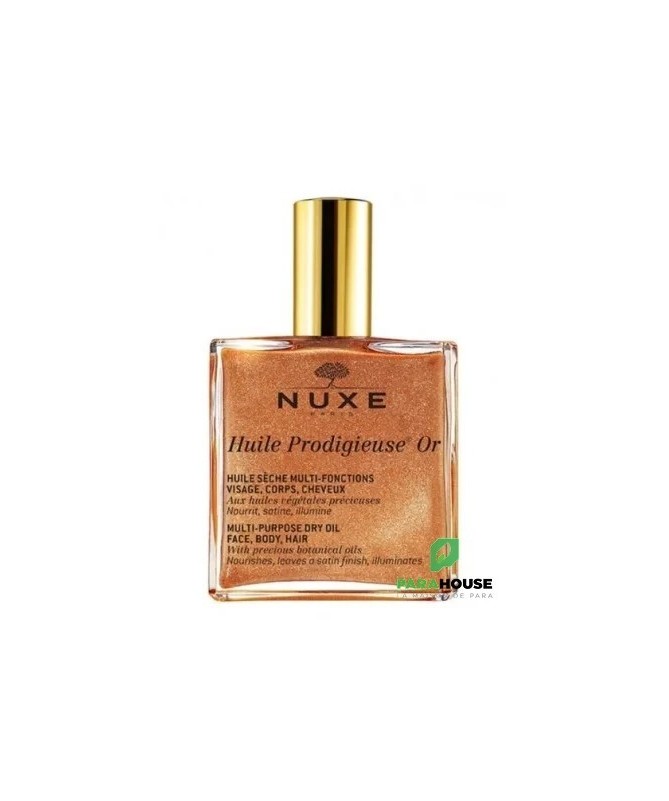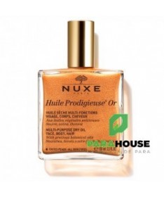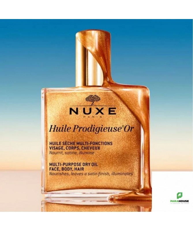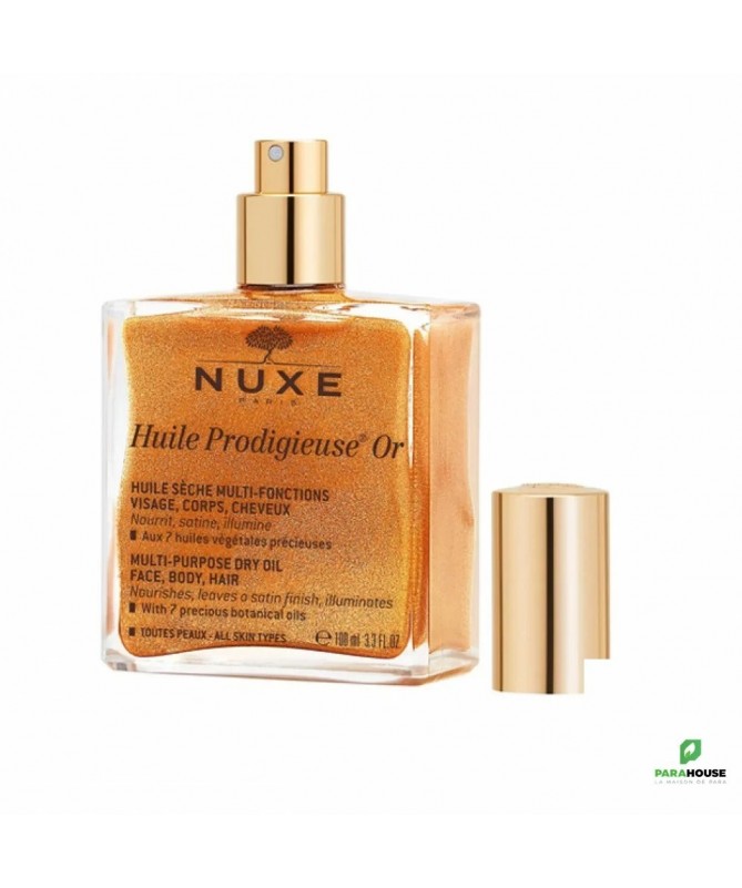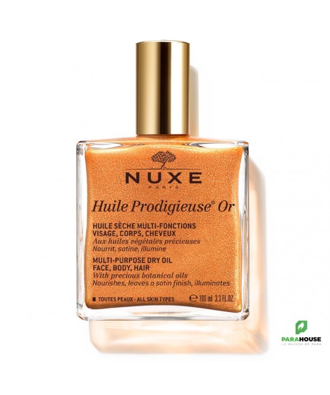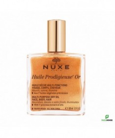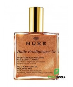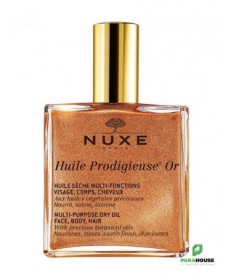 NUXE Huile Prodigieuse OR 100ML NUXE Huile Prodigieuse OR aux nacres dorées d'origine naturelle offre un irrésistible éclat irisé à tous les types de peaux et toutes les carnations. Elle satine et illumine en un seul geste visage, corps et cheveux et hydrate la peau. Votre peau est sublimée, douce et soyeuse, sans fini gras. Son efficacité est prouvée : elle offre une hydratation longue durée, le peau est satinée et lumineuse pour 100 % des utilisatrices. Sa texture au toucher sec inimitable vous est proposée sous forme de flacon spray. Chaque pulvérisation libère un parfum addictif de soleil et de sable chaud qui vous fait rayonner de sensualité. Résultats : Peau est satinée pour 100% des utilisatrices après la 1ère application Peau lumineuse pour 100% des utilisatrices après la 1ère application Peau est plus belle pour 95% des utilisatrices après la 1ère application Composition : INGREDIENTS : COCO-CAPRYLATE/CAPRATE, MACADAMIA INTEGRIFOLIA SEED OIL, DICAPRYLYL ETHER, CAPRYLIC/CAPRIC TRIGLYCERIDE, PRUNUS AMYGDALUS DULCIS (SWEET ALMOND) OIL, CORYLUS AVELLANA (HAZELNUT) SEED OIL, MICA, CAMELLIA OLEIFERA SEED OIL, PARFUM/FRAGRANCE, CAMELLIA JAPONICA SEED OIL, CASTOR OIL/IPDI COPOLYMER, CI 77891/TITANIUM DIOXIDE, ARGANIA SPINOSA KERNEL OIL, BORAGO OFFICINALIS SEED OIL, TOCOPHEROL, CI 77491/IRON OXIDES, HELIANTHUS ANNUUS (SUNFLOWER) SEED OIL, TOCOPHERYL ACETATE, ROSMARINUS OFFICINALIS (ROSEMARY) LEAF EXTRACT, POLYGLYCERYL-3 DIISOSTEARATE, AQUA/WATER, ASCORBIC ACID, SOLANUM LYCOPERSICUM (TOMATO) FRUIT EXTRACT, LINALOOL, LIMONENE, CITRONELLOL, GERANIOL. [N2213/C] CONSEILS D'UTILISATION: Il est recommandé d'Utiliser l'huile prodigieuse or nuxe toute l'année, hiver comme été, sur le visage, le corps et les cheveux. Appliquer l'huile sèche pailletée sur le visage et le corps pour nourrir, adoucir et satiner la peau. Sur le visage, mélangez quelques gouttes d’Huile Prodigieuse Or avec votre crème NUXE. Sur le corps, massez l'Huile Prodigieuse® Or sur vos jambes de bas en haut pour capter la lumière et leur donner un reflet satiné. A l’approche de l’été, Il est conseillé de mélanger dans le creux de la main quelques gouttes d’huile sèche avec votre lait corps hydratant pour des jambes de rêve.