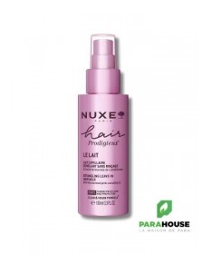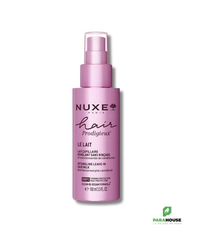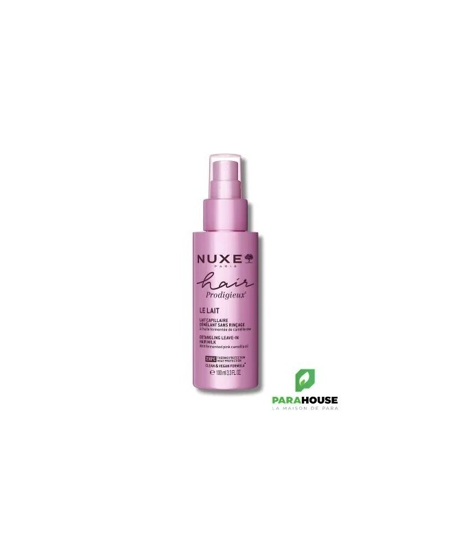 Nuxe Hair Prodigieux - Lait Capillaire Démêlant Sans RinçageLelait capillaire démêlant sans rinçagedeNuxe Hair Prodigieuxest enrichi enhuile de camélia bio,huile de jojoba,extraits d’avoineetprotéines végétales. Satexture lactée ultra-légèreenveloppe la fibre capillaire sans effet gras pour une chevelurehydratée, brillante et douce.Format spray 100 ml pratique, sur cheveux secs ou mouillésParfum iconique Prodigieux®Convient à tous les types de cheveux : secs, bouclés, fins, colorés, crépus, abîmésBienfaitsDémêle sans casser la fibre capillaireHydrate et nourrit en profondeurProtège de la chaleur jusqu’à 230°C (action thermoprotectrice)Réduit les frisottis et facilite le coiffageApporte brillance et souplesse sans alourdirFormule sans rinçage, vegan et sans siliconesActifsHuile fermentée de camélia rose: nourrit et protègeExtrait de quinoa: lisse la cuticule, effet anti-frisottisConseils d'utilisationAgitez le flacon avant emploiVaporisez sur les longueurs et pointes, sur cheveux secs ou mouillésPeignez ou démêlez délicatementNe pas rincerÀ utiliserau quotidienou enretouche dans la journéepour raviver l’éclat ou dompter les frisottis. Peut être utilisé seul ou en complément du shampoing et masque Nuxe Hair Prodigieux.