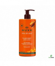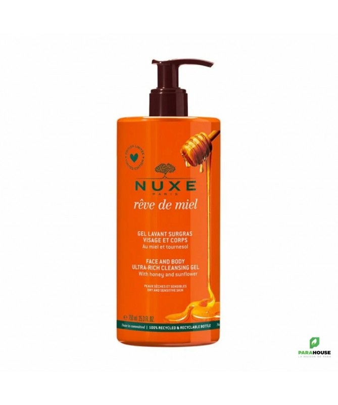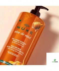 Nuxe Reve de miel Gel Lavant SURGRAS 750ML Nuxe Reve de miel Gel Lavant SURGRAS est un gel nettoyant démaquillant doux au Miel et Tournesol nettoie, apaise et démaquille en un seul geste, tout en douceur. Un régal des sens pour une belle peau. Nuxe Rêve de miel Gel Lavant SURGRAS un gel douche visage et corps - nettoie, apaise et adoucit. Pour les peaux sèches et sensibles. Résultats : Nettoie sans dessécher pour 91% des volontaires dès la 1ère application Peau plus confortable pour 100% des volontaires dès la 1ère application Composition : Principaux actifs d'origine naturelle : Miel, Tournesol, Coco, Allantoïne.. Contient 92 % d'ingrédients d'origine naturelle AQUA/WATER, GLYCERIN, SODIUM COCOAMPHOACETATE, SODIUM LAUROYL SARCOSINATE, LAURYL GLUCOSIDE, PARFUM/FRAGRANCE, MEL/HONEY, SUNFLOWER SEED OIL PEG-8 ESTERS, SODIUM COCOYL GLUTAMATE, SODIUM LAURYL GLUCOSE CARBOXYLATE, ACRYLATES/C10-30 ALKYL ACRYLATE CROSSPOLYMER, PHENOXYETHANOL, GLUCONOLACTONE, SODIUM HYDROXIDE, COCO-GLUCOSIDE, GLYCERYL OLEATE, CITRIC ACID, ALLANTOIN, SODIUM BENZOATE, TETRASODIUM GLUTAMATE DIACETATE, 1,2-HEXANEDIOL, CAPRYLYL GLYCOL, CARAMEL, CALCIUM GLUCONATE, TROPOLONE, HYDROGENATED PALM GLYCERIDES CITRATE, TOCOPHEROL [N2002/A]. CONSEILS D'utilisation Il est recommandé d'Utiliser NUXE le Gel Nettoyant et Démaquillant Visage matin et/ou soir, masser sur une peau humide, faire mousser puis rincer à l'eau claire. Eviter le contact avec les yeux.