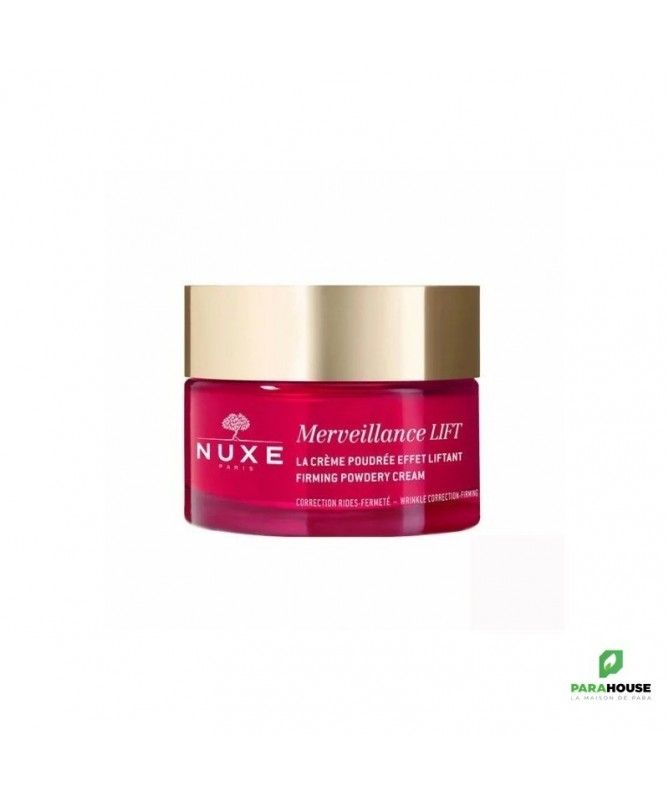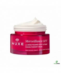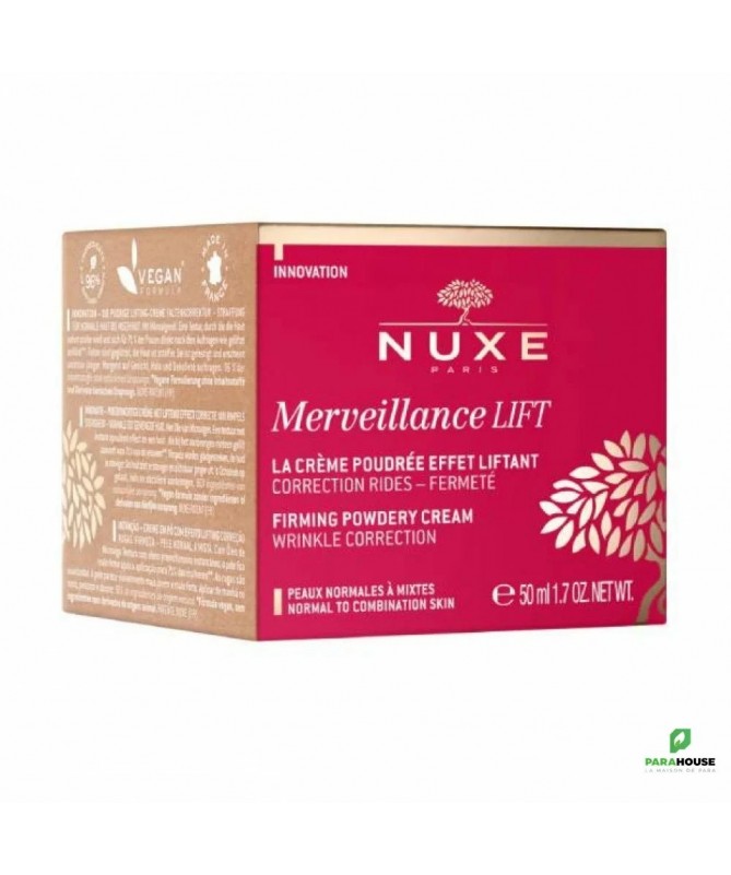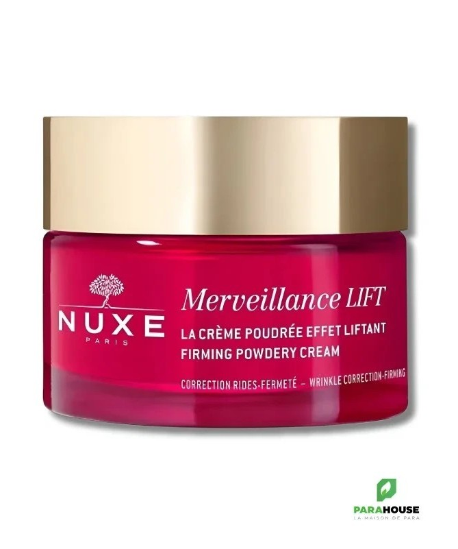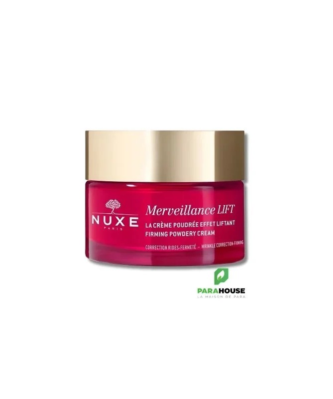NUXE Merveillance Lift Crème Poudrée Effet Liftant 50ML NUXE Merveillance Lift Creme Poudree Effet Liftant procure un véritable effet lifting à votre visage et votre cou, lisse et raffermit le grain de votre peau. NUXE MERVEILLANCE LIFT est une crème lissante infusée d’Huile de Micro-Algue ultra-corrective, un actif green (4) qui concentre en une seule goutte la puissance de 4 milliards de cellules actives pour renforcer votre peau au quotidien. Idéale pour les peaux normales à mixtes, la texture poudrée de NUXE MERVEILLANCE LIFT offre un effet flouteur naturel pour un fini "zéro défaut". Une efficacité anti-âge et un plaisir ultime aux délicats accords floraux et musqués. Dès l'application, la peau est comme liftée pour 71% des femmes. En 2 mois, elle est plus lisse : +63%. Les rides sont corrigées. Plus ferme, la peau parait visiblement plus jeune. Composition : INGREDIENTS : AQUA/WATER, SQUALANE, GLYCERIN, 2,3-BUTANEDIOL, MACADAMIA INTEGRIFOLIA SEED OIL, SODIUM POLYACRYLATE, ARACHIDYL ALCOHOL, CETEARYL ALCOHOL, BEHENYL ALCOHOL, PARFUM/FRAGRANCE, ETHYLHEXYLGLYCERIN, ARACHIDYL GLUCOSIDE, PHENETHYL ALCOHOL, SODIUM STEAROYL GLUTAMATE, SODIUM GLUCONATE, CAPRYLIC/CAPRIC TRIGLYCERIDE, HELIANTHUS ANNUUS (SUNFLOWER) SEED OIL, ALTHAEA OFFICINALIS ROOT EXTRACT, UNDARIA PINNATIFIDA EXTRACT, SODIUM HYDROXIDE, BENZYL ALCOHOL, CHLORELLA VULGARIS EXTRACT, ACETYL TETRAPEPTIDE-5, DEHYDROACETIC ACID, ROSMARINUS OFFICINALIS (ROSEMARY) LEAF EXTRACT, LINALOOL, ALPHA-ISOMETHYL IONONE, GERANIOL, CITRONELLOL, LIMONENE Formule végane sans ingrédients ni dérivés d'origine animale. 96% du total des ingrédients sont d'origine naturelle. Conseils d'utilisation : Prélevez une noisette généreuse de soin et faites-la chauffer entre vos mains. Appliquez-la sur votre visage avec vos deux mains à plat, toujours du centre vers l'extérieur, en évitant le contour des yeux. Faites-en aussi profiter votre cou et votre décolleté. Massez jusqu'à la pénétration complète de la crème. Le matin, finissez par de légers tapotements du bout des doigts sur l'ensemble du visage pour réveiller l'éclat de votre teint. Le soir, apposez doucement vos mains sur vos joues, puis votre front et votre menton et enfin au centre du visage (autour du nez). Appliquez le matin et/ou le soir idéalement après votre sérum.