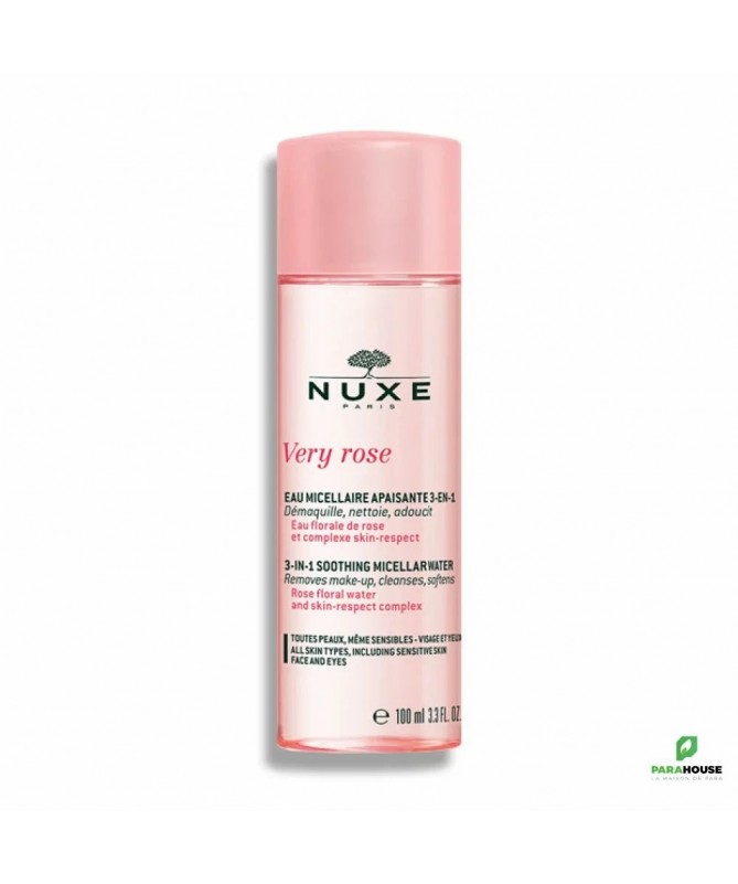 NUXE VERY ROSE Eau Micellaire Apaisante 3-en-1 - Peaux sensibles 100ML NUXE VERY ROSE Eau Micellaire Apaisante 3 en 1 Toutes peaux, même sensibles est un nettoyant visage 3 en 1 qui élimine délicatement le maquillage et les impuretés. Enrichi d'un complexe 100% végétal Skin-Respect de NUXE, il apaise le visage et les sens, laissant la peau douce et fraîche. Son délicat parfum de rose favorise la détente tandis que son effet démaquillant parfait rend ce produit idéal pour tous les types de peau. Résultats : Nettoyage de la peau efficace pour 96% des volontaires Peau nettoyée en douceur pour 100% des volontaires Composition : L’eau micellaire apaisante very rose contient : - De l’Eau Florale de Rose : apaisante et adoucissante sur toutes les peaux, même les plus sensibles. - Un Complexe Skin-Respect 100% d’origine végétale : Se compose de Sucres Hydratants, hydrate et renforce la barrière cutanée de la peau - Des Agents nettoyants micellaire : éliminent efficacement les impuretés et le maquillage tout en assurant une bonne tolérance à la peau * testée sous contrôle dermatologique. *Formule sans ingrédients ni dérivés d’origine animale *97 % du total des ingrédients sont d'origine naturelle INGEDIENTS : AQUA/WATER, GLYCERIN, PEG-6 CAPRYLIC/CAPRIC GLYCERIDES, PENTYLENE GLYCOL, ROSA DAMASCENA FLOWER WATER, PARFUM/FRAGRANCE, SODIUM GLUCONATE, CETRIMONIUM BROMIDE, XYLITYLGLUCOSIDE, ANHYDROXYLITOL, XYLITOL, CITRIC ACID, SODIUM HYDROXIDE, PHENOXYETHANOL [N4105/A]. Conseils d'utilisation: Avec un coton d'eau micellaire, appliquez délicatement matin et soir sur le visage et les yeux. Renouvelez l'application NUXE VERY ROSE Eau Micellaire jusqu'à ce que le coton soit propre. Sans rinçage.