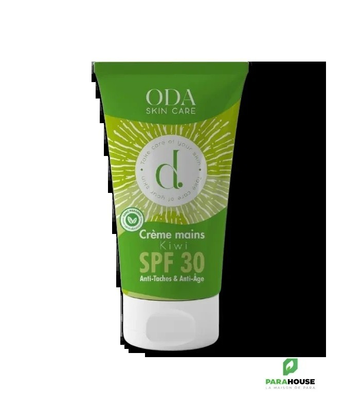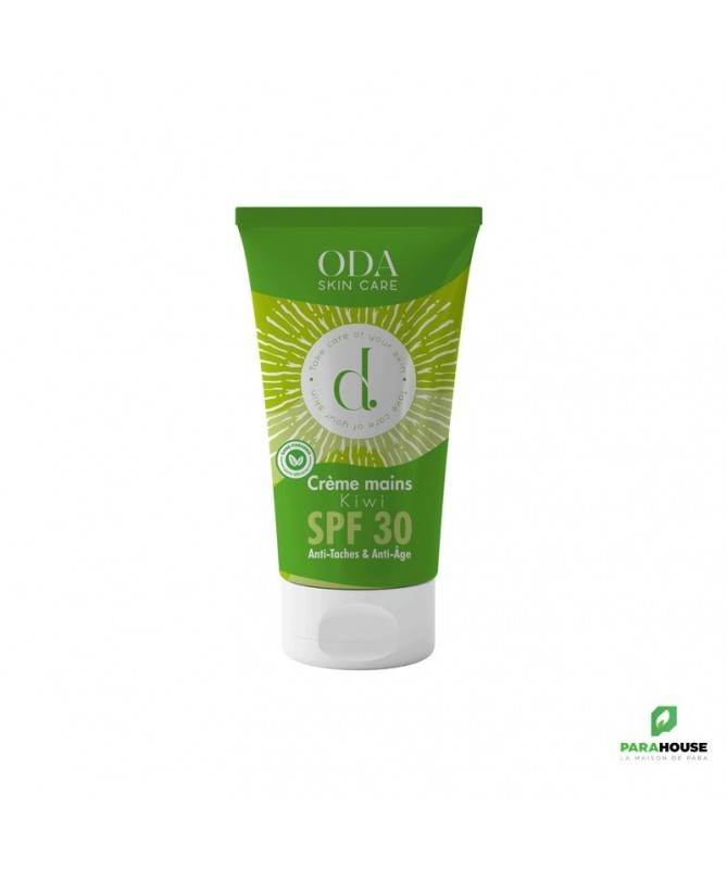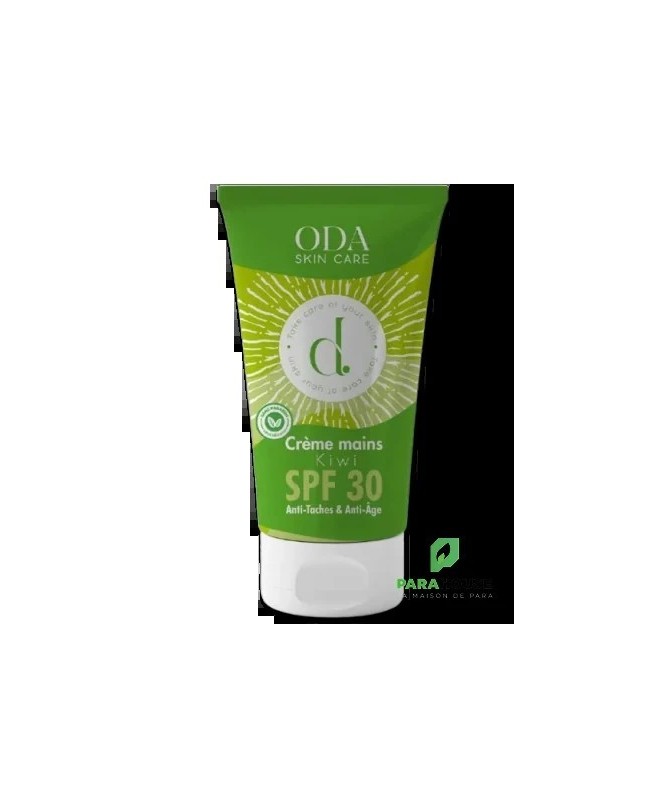 Crème Mains SPF 30 Kiwi ODALa Crème Mains SPF 30 Kiwi ODA est formulée pour prévenir et traiter les signes de vieillissement cutané tout en réduisant les taches brunes sur les mains. Sa texture légère est rapidement absorbée, favorisant la fermeté et l’élasticité de la peau tout en l’hydratant pendant 24 heures.Avec une protection SPF 30, cette crème prévient la formation de nouvelles taches brunes et le vieillissement causé par le soleil. Son parfum frais de kiwi apporte une touche agréable à votre routine de soin.Convient à tous les types de peau, elle laisse vos mains douces, lisses, jeunes et délicieusement parfumées.Mode d’emploi :Appliquez deux fois par jour, une petite quantité de crème sur vos mains. Massez jusqu’à absorption complète. Évitez tout contact avec les yeux.Ingrédients :Acide hyaluroniqueExtrait de pelure de citron (Acb Lemon Peel extract)Vitamine EProtection UVA et UVBPrenez soin de vos mains et préservez leur jeunesse avec la Crème Mains SPF 30 Kiwi ODA.