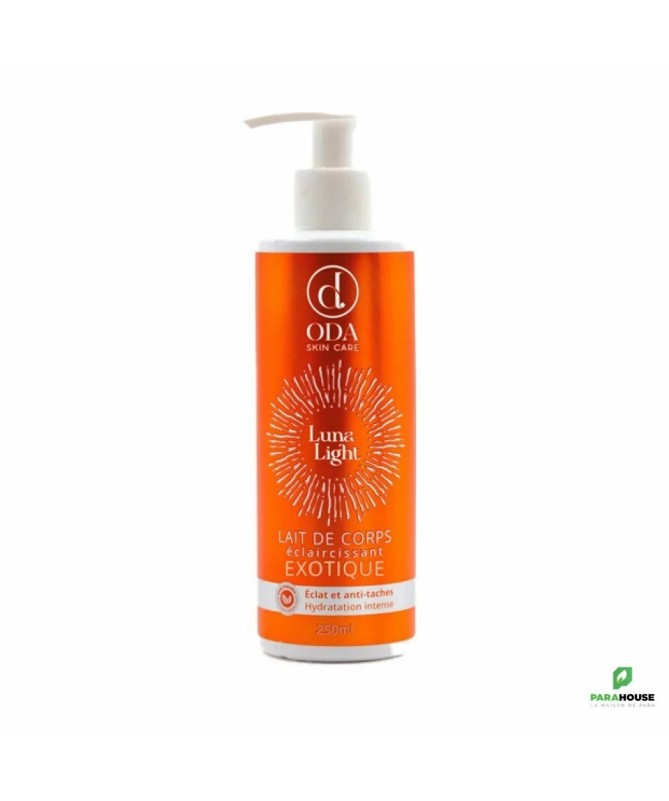 ODA LunaLight Lait de Corps Exotique 250ML ODA LunaLight Lait de Corps Exotique est est un soin pour le corps éclaircissant, grâce à sa formule enrichie d'actifs , pour hydrater et nourrir la peau tout en unifiant le teint. ODA LunaLight Lait de Corps est idéal pour les peaux ternes, métisses, ou sujettes à l'hyperpigmentation. Il pénètre facilement dans la peau pour la laisser douce ,souple, lisse et lumineuse. Composition : ACB LEMON PEEL EXTRACT. AC DERMAPEPETIDE LIGHTENING. Hydrolat de citron. Glycérine. Vitamine E. Conseils d'utilisation : Il est recommandé d'utiliser ODA LunaLight Lait de Corps Exotique 1 à 2 fois par jour pour voir les résultats et sans être exposé au soleil. À appliquer sur une peau sèche et sur tout le corps.