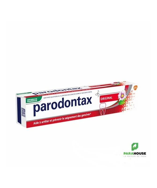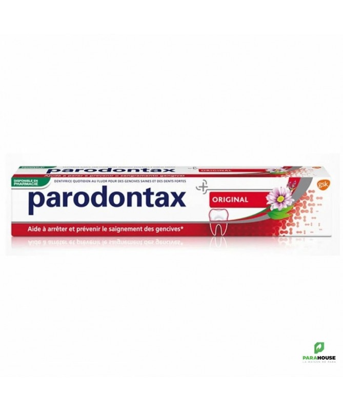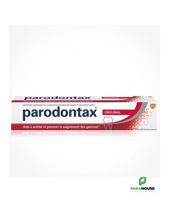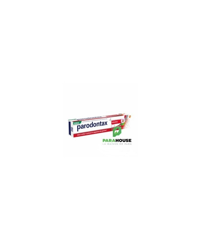 PARODONTAX ORIGINAL 75ML PARODONTAX DENTIFRICE ORIGINAL est spécialement formulé pour aider à arrêter et prévenir le saignement des gencives, pour des gencives saines, des dents fortes et une haleine fraîche. LE DENTIFRICE QUOTIDIEN PARODONTAX AIDE À ARRÊTER LE SAIGNEMENT DES GENCIVES Des gencives saines ne saignent pas. Si vous voyez des traces de sang lors du brossage ou lors du passage de fil dentaire, cela peut être un signe d'une inflammation des gencives. L'inflammation non traitée peut se développer et conduire à une mauvaise haleine, à des gencives rouges et gonflées, et au fil du temps, au déchaussement des dents. C'est pourquoi il est important de ne pas ignorer un saignement des gencives. PARODONTAX DENTIFRICE ORIGINAL est 4 fois plus efficace contre la plaque dentaire, principale cause du saignement* des gencives. Il est cliniquement prouvé que le dentifrice quotidien parodontax aide à arrêter et à prévenir le saignement* des gencives. Le dentifrice quotidien parodontax contient 1 400 ppm de fluor pour renforcer les dents, ainsi que du bicarbonate de sodium pour aider à éliminer la plaque dentaire, et un mélange d'extraits végétaux naturels, ce qui lui confère un goût unique. Il peut falloir un peu de temps pour s'habituer à son goût, mais après 14 jours d'utilisation, la plupart des personnes qui l'ont testé, l'ont apprécié. Utilisé au quotidien, il aide à conserver des gencives saines, des dents fortes et une haleine fraîche. Composition : Sodium Bicarbonate, Aqua, Glycerin, Alcohol, Cocamidopropyl Betaine, Mentha Arvensis, Mentha Piperita Oil, Xanthan Gum, Echinacea Purpurea Flower/Lef/Steam Juice, Kramerua Triandra Extract, Sodium Fluoride, Chamomilla Recutita Extract, Salvia Officinalis Oil, Commiphora Myrrha Extract, Limonene, Sodium Saccharin, Linalool, CI77491. Conseils d'utilisation Il est recommandé de se brosser les dents avec le dentifrice quotidien parodontax 2 fois par jour et de ne pas dépasser 3 brossages. Evitez d'avaler le dentifrice et recrachez-le après le brossage. En cas d'irritation, arrêtez l'utilisation. Ne convient pas aux enfants de moins de 12 ans.