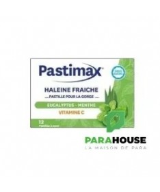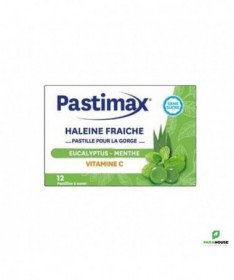 Pastimax Haleine fraiche à l'eucalyptus et la menthe extra forte est une pastille pour la gorge, sans sucre, enrichie en source de vitamine C pour une haleine fraiche.