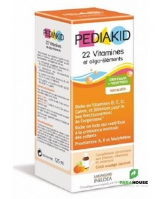 DescriptionPediakid 22 Vitamines & Oligo-Eléments 125 ml goût orange abricot est un complément alimentaire sous forme de sirop.Adapté aux enfants et préadolescents, ce sirop associe des plantes, mais aussi des vitamines et des minéraux pour optimiser les apports en micronutriments essentiels, afin de participer au bon fonctionnement de l'organisme et à l'équilibre général.Il est riche en Vitamines Pro-A, E, C, D, B1, B2, B3, B5, B6, B8, B9, B12, en Cuivre, Molybdène, Sélénium et Iode, qui participent, chacun à leur niveau, au métabolisme énergétique et des nutriments, aux fonctions psychiques, au fonctionnement du système immunitaire.