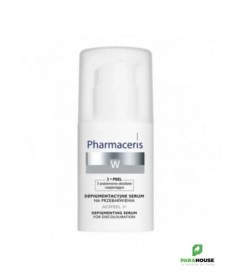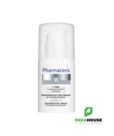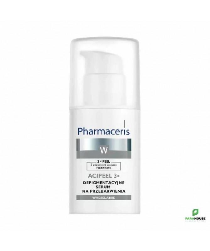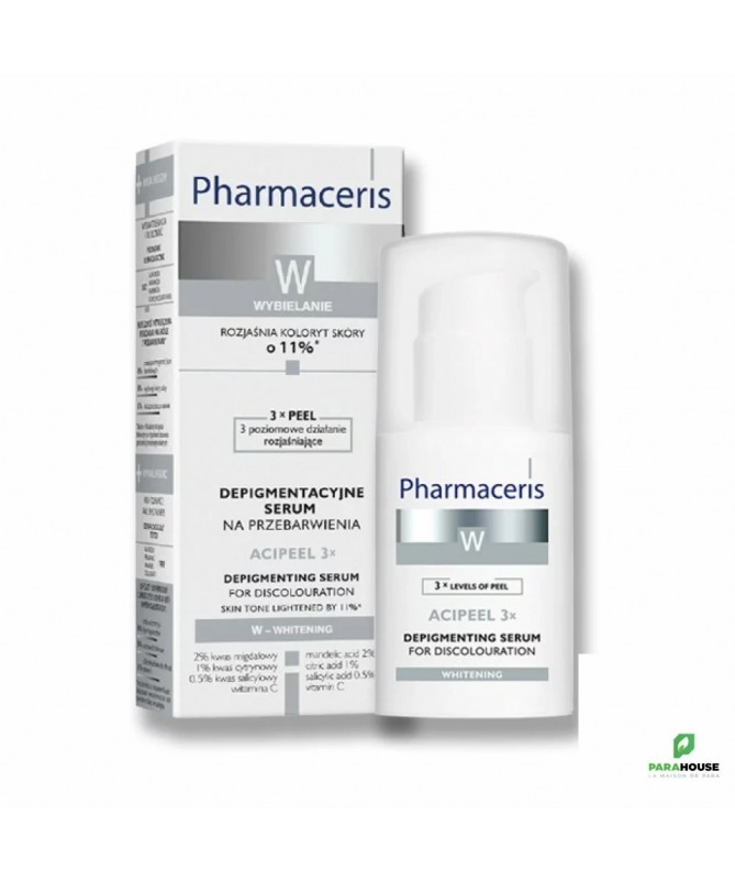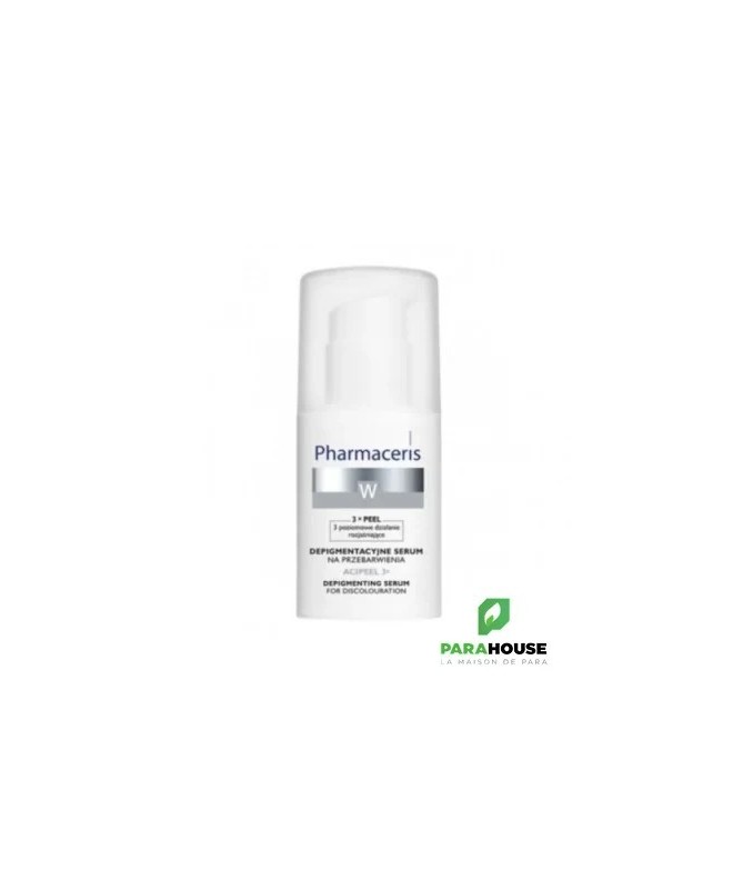 PHARMACERIS W ACIPEEL 3X Depigmenting Serum 30ML PHARMACERIS W ACIPEEL 3X Serum est un sérum destiné pour être utilisé le soir pour éliminer l'hyperpigmentation cutanée et retrouver un teint unifié et lumineux. Ce soin respecte la peau même la plus sensible et améliore nettement les irrégularités liées à l’hyperpigmentation. Grâce à ses principes actifs de trois acides et une forme biologiquement active de vitamine C, PHARMACERIS W ACIPEEL 3X permet de corriger et prévenir l’apparition des taches en contrôlant et inhibant la production excessive de mélanine. Lors de l'utilisation du produit, vous pouvez ressentir une rougeur temporaire de la peau. Efficacité : 67% effectively exfoliates the epidermis 60% reduces intensity of hyperpigmentation 60% evens out skin tone exfolie efficacement l’épiderme à 67% réduit l’intensité de l’hyperpigmentation à 60% unifie le teint à 60% Composition : Ingredients: Aqua (Water), Salicylic Acid, Ceteth-20, Steareth-20, Xanthan Gum, Polysilicone-11, Dextrin, Cyclopentasiloxane, C12-15 Alkyl Benzoate, Caprylic/Capric Triglyceride, Propylene Glycol, Glyceryl Stearate, Cetyl Alcohol, 1,2-Hexanediol, Glycerin, Mandelic Acid, Tromethamine, Cetearyl Alcohol, PEG-75 Stearate, Citric Acid, Aloe Barbadensis Leaf Juice, Dimethicone, Carbomer, Ascorbyl Tetraisopalmitate, Tocopheryl Acetate, Polydextrose, Ethylhexylglycerin, Amylopectin, Niacinamide , Linoleic Acid, BHA, Linolenic Acid, Phenoxyethanol, Potassium Sorbate, Sodium Benzoate. SANS PARFUM Conseils d''utilisation : Ce sérum est recommandé pour une utilisation nocturne comme traitement blanchissant pour la peau présentant une hyperpigmentation ou un teint inégal. Le produit doit être appliqué localement sur les zones affectées par l’hyperpigmentation telles que les taches de rousseur, les taches de vieillesse, les taches brunes, les lentigines solaires et l’hyperpigmentation post-acnéique, post-inflammatoire ou de grossesse (par exemple le mélasma). Il est recommandé d'éviter le contour des yeux et autour de la bouche. Appliquez crème FPS 50+ de la gamme Pharmaceris W le matin.