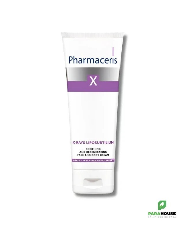 Pharmaceris X Rays Liposubtilium - Crème Soin Post-RadiothérapiePHARMACERIS X RAYS LIPOSUBTILIUMest une crème spécialisée, recommandée pour le soin de la peau après une radiothérapie. Elle offre une action hydratante et relipidante durable grâce à sa composition unique en principes actifs.Enrichie enacide folique, cette préparation favorise la régénération des cellules cutanées endommagées par les rayons X. Elle apaise les irritations et soulage la peau, tout en contribuant à la réparation cellulaire.Ingrédients clés- Acide folique: Stimule la réparation de l'ADN des cellules cutanées exposées à l'irradiation.- Cire d'abeille: Nourrit, hydrate et forme un film protecteur pour prévenir le dessèchement.- Panthénol: Apaise, hydrate et relipidante la peau, tout en protégeant contre les irritations.Résultats- 89% des utilisateurs constatent une peau hydratée- 89% des utilisateurs notent une diminution des rougeursCompositionAqua, Paraffinum Liquidum, Pentylene Glycol, Isododecane, Panthenol, Glycerin, Cetyl PEG/PPG-10/1 Dimethicone, Polyglyceryl-4 Isostearate, Lecithin, Soluble Collagen, Folic Acid, BHT, Paraffin, C10-18 Triglycerides, Cera Alba, Triisostearin, Magnesium Sulfate, Stearic Acid, Sorbitol, Hydrolyzed Elastin, Hydroxyethylcellulose, Disodium EDTA, Ethylhexylglycerin, Methylparaben, Phenoxyethanol.Conseils d'utilisationAppliquez une petite quantité de la crèmePHARMACERIS X RAYSsur une peau propre du visage et du corps, deux fois par jour.