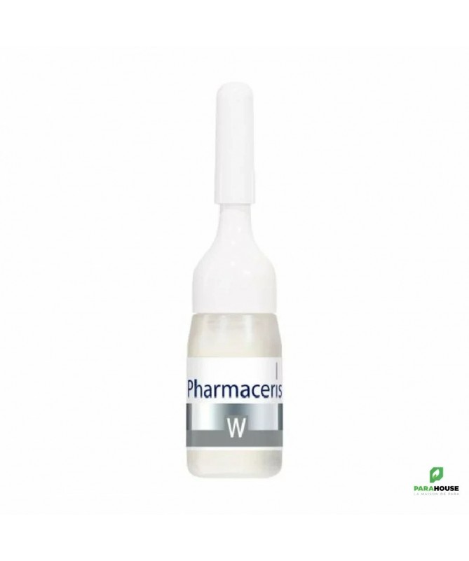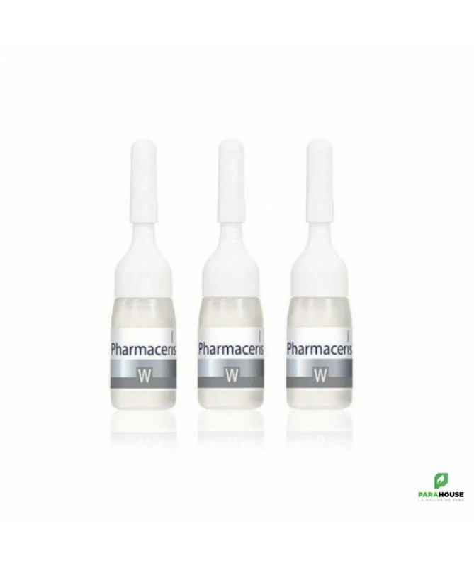 PHARMACERIS W ALBUCIN PP 3 AMPLOULES PHARMACERIS W ALBUCIN PP est un programme éclaircissant qui vise à corriger les taches brunes. Il se présente sous forme des ampoules (3x4 ml) qui réduit les taches brunes tout en unifiant le teint. ALBUCIN PP est destiné pour les soins quotidiens de la peau : le visage, le cou, le décolleté et les bras avec une hyperpigmentation à savoir les taches brunes ou un teint inégal. Ce programme est recommandé pour les peaux normales et grasses. Sa formule riche en niacinamide vise à réduir la production de mélanine, ce qui empêche la formation de taches. L’écorce de saule et de la biotine permettent l’exfoliation des cellules mortes de la peau qui réduit la visibilité de décoloration déja existante, lisse les pores et améliore par la suite la texture de la peau. Efficacité : Éclaircit la peau à 77% Adoucit la peau à 81% Tonifie la couleur de la peau à 77% Réduit l’hyperpigmentation à 73% Composition : Niacinamide (vitamine B3, vitamine PP) : aide à régénérer la barrière lipidique de l’épiderme en renforçant les vaisseaux sanguins et en réduisant leur visibilité. Il stimule la synthèse du collagène et normalise la production de céramides et la maturation de l’épiderme. Il améliore les niveaux d’hydratation de la peau, augmente l’élasticité et évite les décolorations. Il rend la peau plus lisse et plus ferme. Acide salicylique : exfolie en douceur les cellules épidermiques mortes. Restaure la structure uniforme de la peau et assure son aspect sain. Extrait d’écorce de saule : présente des propriétés antibactériennes et a un effet apaisant sur la peau. Il possède des propriétés antiseptiques et régule le processus d’exfoliation des cellules mortes de la peau afin d’éviter de nouvelles imperfections. Ingredients: Aqua (Water), Glycerin, Niacinamide, Panthenol, Polysorbate 20, Allantoin, Acrylates/C10-30 Alkyl Acrylate Crosspolymer, Triethanolamine, Ethylhexylglycerin, Salix Alba (Willow) Bark Extract, Citric Acid, Zinc PCA, Arctium Lappa Root Extract, Biotin, Phenoxyethanol, Methylparaben, Sodium Benzoate, Potassium Sorbate. SANS PARFUM Conseils d'utilisation : Il est conseillé d'utiliser PHARMACERIS W ALBUCIN PP d'une façon quotidienne soit le matin soit au coucher sur une peau propre Attender jusqu’à ce que le produit soit parfaitement absorbé. Une Cure de 4-6 semaines avec une application quotidienne. PHARMACERIS W ALBUCIN PP peut être utilisé comme un traitement de jour ou de nuit.