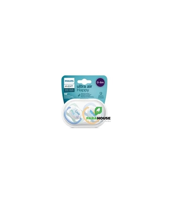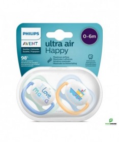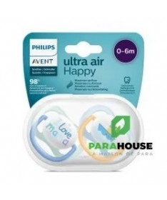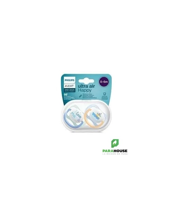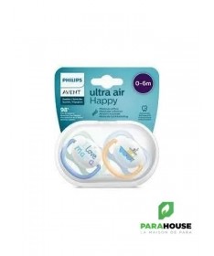 Sucette Avent Natural Ultra Air Happy 0-6mois Bleu. La sucette Avent Natural Ultra Air apaise votre bébé grâce à sa tétine qui permet à la peau de respirer. La collection Philips Avent ultra air est dotée de très grands trous pour garder la peau de votre bébé sèche. Le bouclier léger est conçu pour une perméabilité à l'air maximale. La sucette Avent Natural tient compte de la forme naturelle du palais, des dents et des gencives. Disponible en plusieurs couleurs et dessins. Ventilation Extra Les très grands trous d'aération garantissent que la peau de votre bébé continue de respirer et reste douce et sèche.Design à la mode La collection ultra air Avent est toujours à jour. Les designs légers et colorés vous permettent, à vous et à votre bébé, d'essayer les derniers styles. Tétine douce et soyeuse La sucette ultra air Avent est légère et a un design entièrement axé sur le confort, auquel contribue la tétine soyeuse et douce. Développement sain de la bouche Prenez soin du développement de la bouche de votre tout-petit avec une tétine symétrique qui respecte la forme naturelle du palais, des dents et des gencives. Stérilisation et stockage faciles La boîte de stockage ultra air Avent peut également être utilisée comme stérilisateur. Il vous suffit d'ajouter de l'eau et de mettre la boîte au micro-ondes. De cette façon, vous pouvez être sûr que la sucette est propre pour la prochaine utilisation.