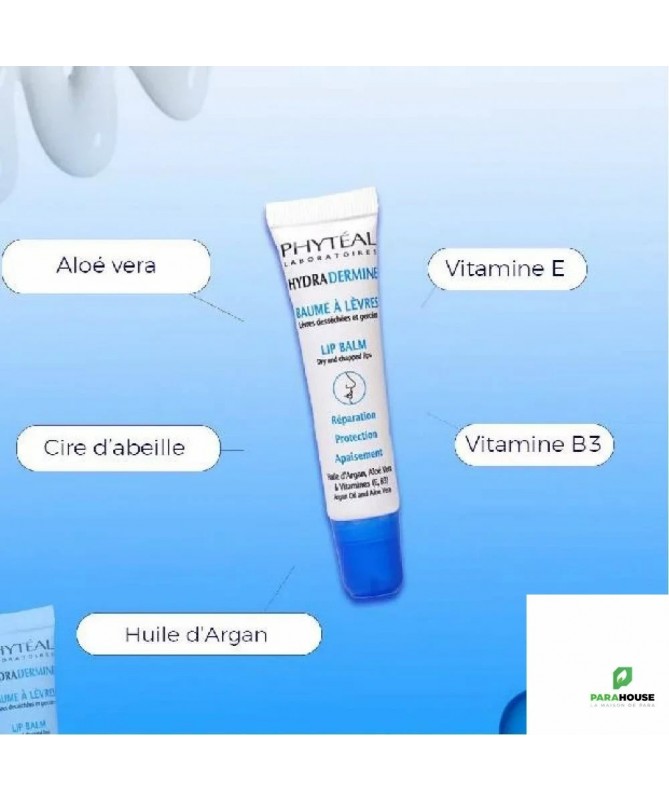 PHYTEAL HYDRADERMINE BAUME A LEVRES 15ML PHYTEAL HYDRADERMINE BAUME A LEVRES est un soin hydratant pour les lèvres desséchées et gercées. HYDRADERMINE BAUME A LEVRES permet de reparer, proteger et apaiser les levres. Composition : Vitamine E Vitamine B3 Aloe vera Cire d'abeille Huile d'argan