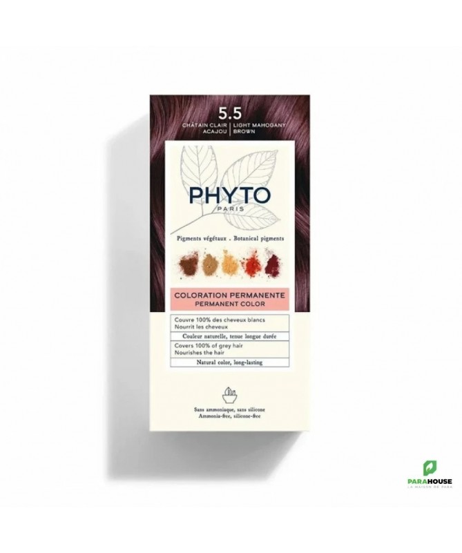 PHYTOCOLOR - COULEUR SOIN 5.5 CHATAIN CLAIR ACAJOU PHYTO COLOR associe haute technologie et expertise des plantes pour une couleur éclatante et ultra brillante : Couvre 100 % des cheveux blancs dès la 1ère application. Assure une tenue longue durée de la couleur. Formulé comme un soin, PHYTO COLOR respecte le cheveu et le cuir chevelu et minimise les risques d'allergies. Facile à appliquer, sa crême onctueuse ne coule pas et permet une répartition précise et uniforme de la racine à la pointe du cheveu. Composition : 1 LAIT RÉVÉLATEUR / MILK DEVELOPER : INGREDIENTS : AQUA / WATER / EAU. CETEARYL ALCOHOL. HYDROGEN PEROXIDE. CETEARETH-33. PHOSPHORIC ACID. OXYQUINOLINE SULFATE. 51000SA. 2 CRÈME COLORANTE / COLORING CREAM 5.5 : INGREDIENTS : AQUA / WATER / EAU. CETEARYL ALCOHOL. ETHANOLAMINE. PROPYLENE GLYCOL. CETEARETH-25. CETETH-2. PEG-2 RAPESEEDAMINE. PEG-4 RAPESEEDAMIDE. TOLUENE-2,5-DIAMINE SULFATE. OXIDIZED CORN OIL. P-AMINOPHENOL. 4-CHLORORESORCINOL. SIMMONDSIA CHINENSIS (JOJOBA) SEED OIL. SODIUM SULFITE. COCOS NUCIFERA (COCONUT) OIL. PROPANEDIOL. 4-AMINO-2-HYDROXYTOLUENE. FRANGULA ALNUS BARK EXTRACT. 2-METHYLRESORCINOL. PARFUM / FRAGRANCE. MALTODEXTRIN. RUBIA TINCTORUM ROOT EXTRACT. POLYQUATERNIUM-22. ASCORBIC ACID. M-AMINOPHENOL. SODIUM HYDROSULFITE. TETRASODIUM EDTA. HAEMATOXYLUM CAMPECHIANUM WOOD EXTRACT. GENISTA TINCTORIA FLOWER/LEAF/STEM EXTRACT. COREOPSIS TINCTORIA FLOWER/LEAF/STEM EXTRACT. ZIZIPHUS JOAZEIRO BARK EXTRACT. GARDENIA TAITENSIS FLOWER. OCTADECYL DI-T-BUTYL-4-HYDROXYHYDROCINNAMATE. PHENYL METHYL PYRAZOLONE. TOCOPHEROL. PH10107. 3 MASQUE PROTECTEUR DE COULEUR / COLOR PROTECTING MASK : INGREDIENTS: AQUA / WATER / EAU. CETYL ALCOHOL. CETEARYL ALCOHOL. BEHENTRIMONIUM CHLORIDE. PHENOXYETHANOL. PARFUM / FRAGRANCE. PONGAMIA GLABRA SEED OIL. ETHYL MACADAMIATE. CETRIMONIUM CHLORIDE. HYDROXYETHYLCELLULOSE. CHLORPHENESIN. PROPYLENE GLYCOL. HYDROLYZED PEA PROTEIN. POLYQUATERNIUM-53. HIBISCUS SABDARIFFA FLOWER EXTRACT. TETRASODIUM EDTA. GLYCERIN. CAESALPINIA SPINOSA FRUIT EXTRACT. CITRIC ACID. DISODIUM PHOSPHATE. POTASSIUM SORBATE. SODIUM PHOSPHATE. POLYSORBATE 60. HELIANTHUS ANNUUS (SUNFLOWER) SPROUT EXTRACT. SODIUM BENZOATE. TOCOPHEROL. MALIC ACID. LIMONENE. LINALOOL. HEXYL CINNAMAL. 1411B. Conseil d'utilisation : Recommandée avant toute coloration ou décoloration, l’HUILE D’ALÈS assure efficacement la protection de la fibre capillaire et du cuir chevelu. En présence de plus de 50 % de cheveux blancs, il est conseillé de mélanger une couleur naturelle à une couleur à reflets pour un résultat optimal.