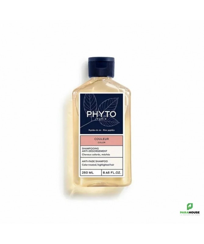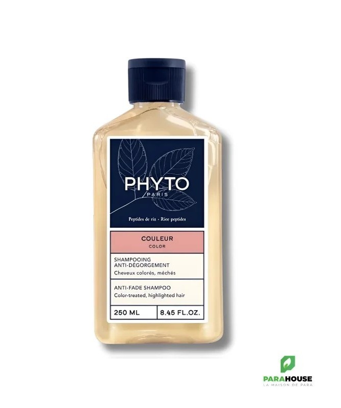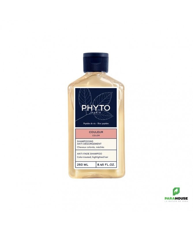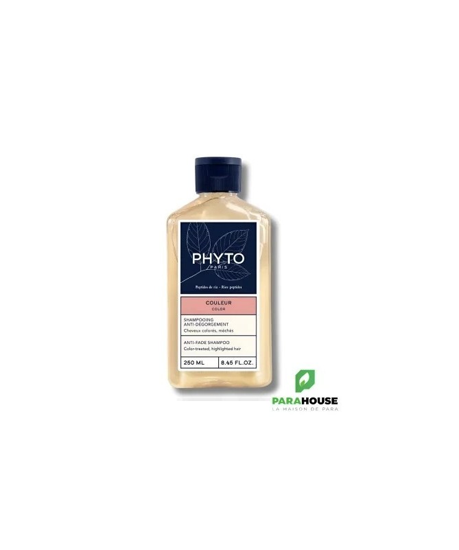 PHYTO COULEUR SHAMPOOING ANTI DEGORGEMENT 250ML PHYTO COULEUR SHAMPOOING ANTI DEGORGEMENT nettoie en douceur pour préserver l’intensité et l’éclat de la couleur. Les cheveux sont doux et la couleur est toujours aussi intense et lumineuse après 12 shampooings*. Au cœur de la formule, un complexe de peptides de riz qui limite le dégorgement des pigments jusqu'à 12 shampooings*. Des tanins de tara et jeunes pousses de tournesol antioxydantes apportent protection à la couleur. Une extraction de mauve blanche rend les cheveux deux fois plus brillants. PHYTO COULEUR SHAMPOOING est sans silicones, sans tensio-actifs sulfatés, sans colorants. Composition : Aqua/Water/Eau*, Cocamidopropyl Betaine, Sodium Lauroyl Sarcosinate, Cocamidopropyl Hydroxysultaine, Sodium Cocoamphopropionate, Glycerin*, Polyquaternium-22, Coco-Glucoside*, Glyceryl Oleate*, Caprylyl Glycol, Parfum/Fragrance, Citric Acid*, Chlorphenesin, Panthenol, Sodium Benzoate, Maltodextrin*, Tetrasodium Glutamate Diacetate, Althaea Officinalis Root Extract*, Hydrolyzed Rice Protein*, Caramel*, Phytic Acid*, Oryza Sativa (Rice) Extract*, Gluconolactone*, Caesalpinia Spinosa Fruit Extract*, Helianthus Annuus (Sunflower) Sprout Extract*, Tocopherol*, Hydrogenated Vegetable Glycerides Citrate*, Calcium Gluconate. *Ingrédients d'origine naturelle. Conseils d'utilisation : Masser une petite quantité sur cuir chevelu mouillé puis rincer. En cas de contact avec les yeux, rincer abondamment. La haute teneur en ingrédients d'origine naturelle peut faire varier la couleur de la formule, sans altérer son efficacité. Shampoing anti-dégorgement. Cheveux colorés, méchés.