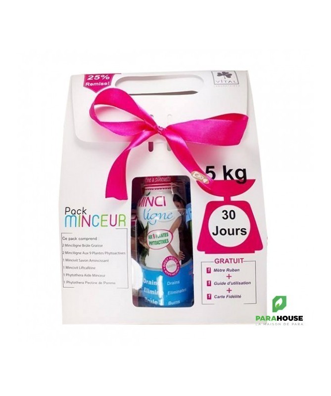 Le Pack Minceur - Perdre 5 Kg en 30 Jours de Vital est un pack composé de 8 soins complémentaires:MINCILIGNE BRULE GRAISSEMINCILIGNE AUX 9 PLANTES PHYOACTIVESMINCILIGNE COUPE FAIMMINCIVIT LIFTCAFEINEPHYTOTHERA AIE MINCEURPHYTOTHERA PECTINE DE POMMENB : Un Metre Ruban, Un Guide d'utilisation et Une Carte de Fidelité sont Offerts