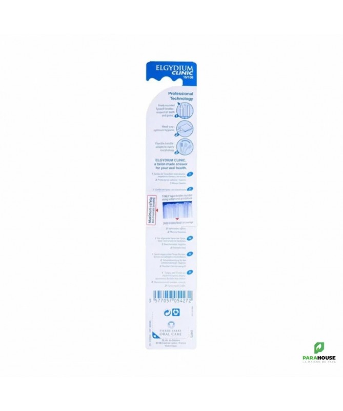 ELGYDIUM BROSSE A DENTS CLINIC 15/100 ELGYDIUM BROSSE A DENTS CLINIC 15/100 Extra-soft, la brosse à dents de transition idéale après une intervention ou en brosse à dents quotidienne pour un confort de brosse extra-souple. La brosse à dents chirurgicale ELGYDIUM Clinic, douce et respectueuse des bouches convalescentes, est en plus assainissable au micro-ondes (1 minute à 600 W en présence d'eau) pour éliminer 99,9 % des bactéries*. Ses brins finement arrondis permet de reprendre progressivement, et tout en douceur, de bonnes habitudes de brossage dès les 2e et 3e semaines suivant l'opération. Des brins finement arrondis de 15/100° de millimètres, parfaits pour les semaines qui suivent une intervention chirurgicale au niveau de la bouche, mais également pour un usage quotidien. Bénéfices : DOUCE : des brins de nylon de haute qualité, finement arrondis, de 15/100° de millimètres, pour une brosse à dents souple. SPÉCIFIQUE : une utilisation recommandée du 8e au 21e jour suivant l'intervention chirurgicale bucco-dentaire, en relais de la brosse à dents ELGYDIUM Clinic Post-Opératoire. HYGIÉNIQUE : une capsule de protection de la tête permet de la ranger à l'abri et de conserver la forme des brins pour plus d'efficacité. Elle est également assainissable au micro-ondes, 600 W, en plongeant la tête dans l'eau une minute seulement."